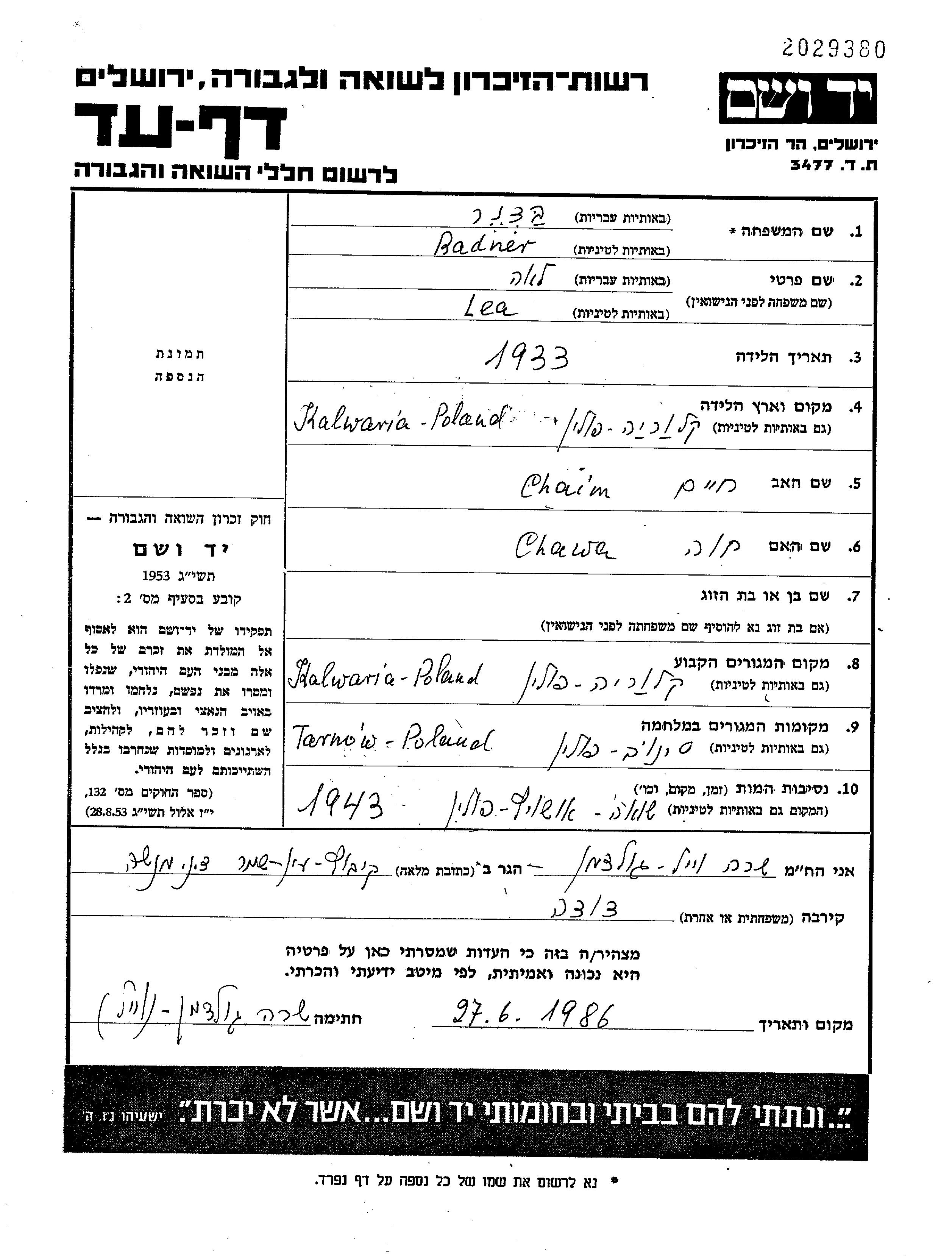 Лея Баднер, место рождения: Кальварья-Зебжидовска, Польша. Отец: Хаим, mать:Хава. Ребенок. Место жительства до войны: Кальварья-Зебжидовска, Польша. Место во время войны: Тарнув, Польша.