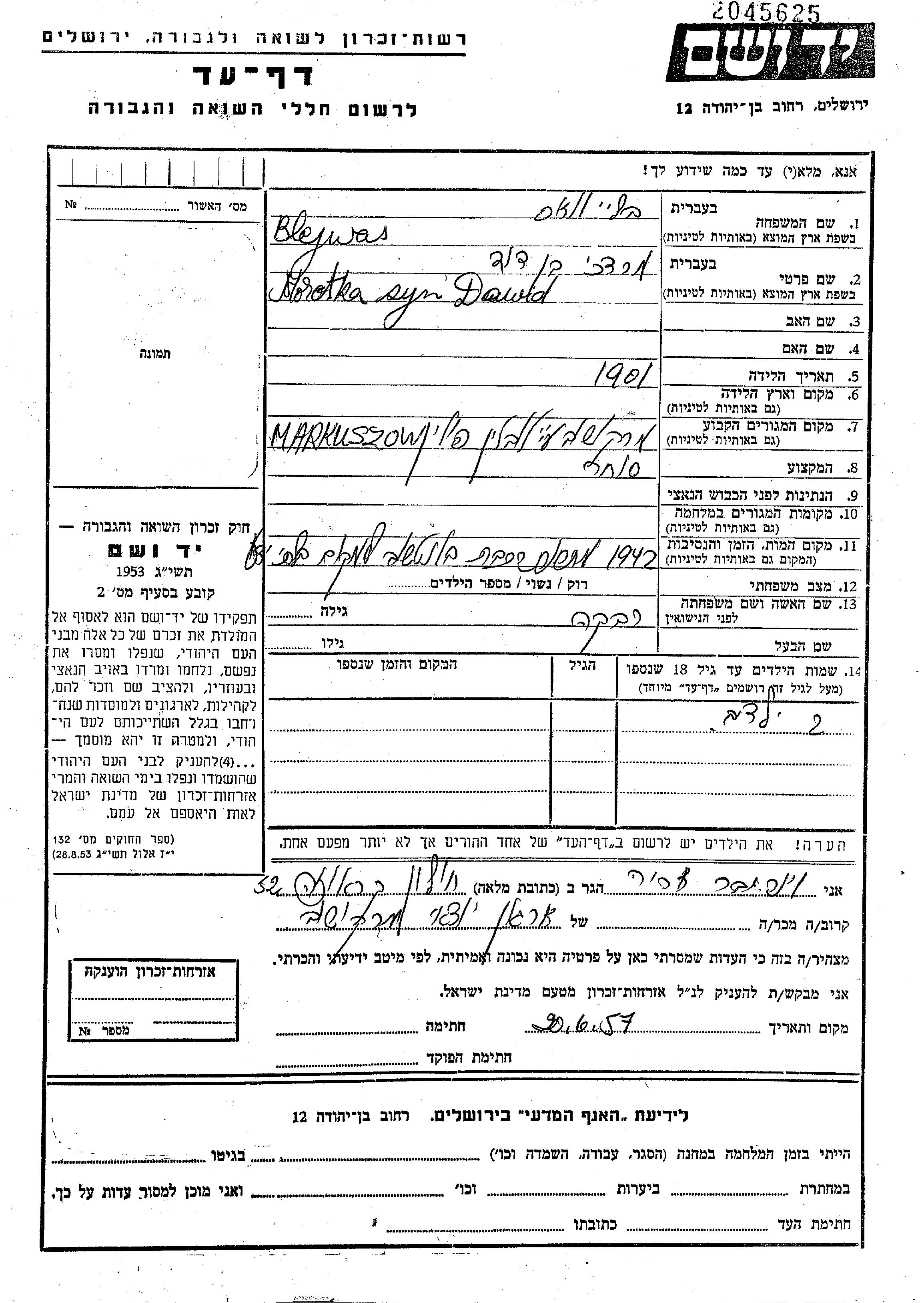 Блейвас Мордехай 1901 Маркушув, Польша Лист свидетельских показаний
