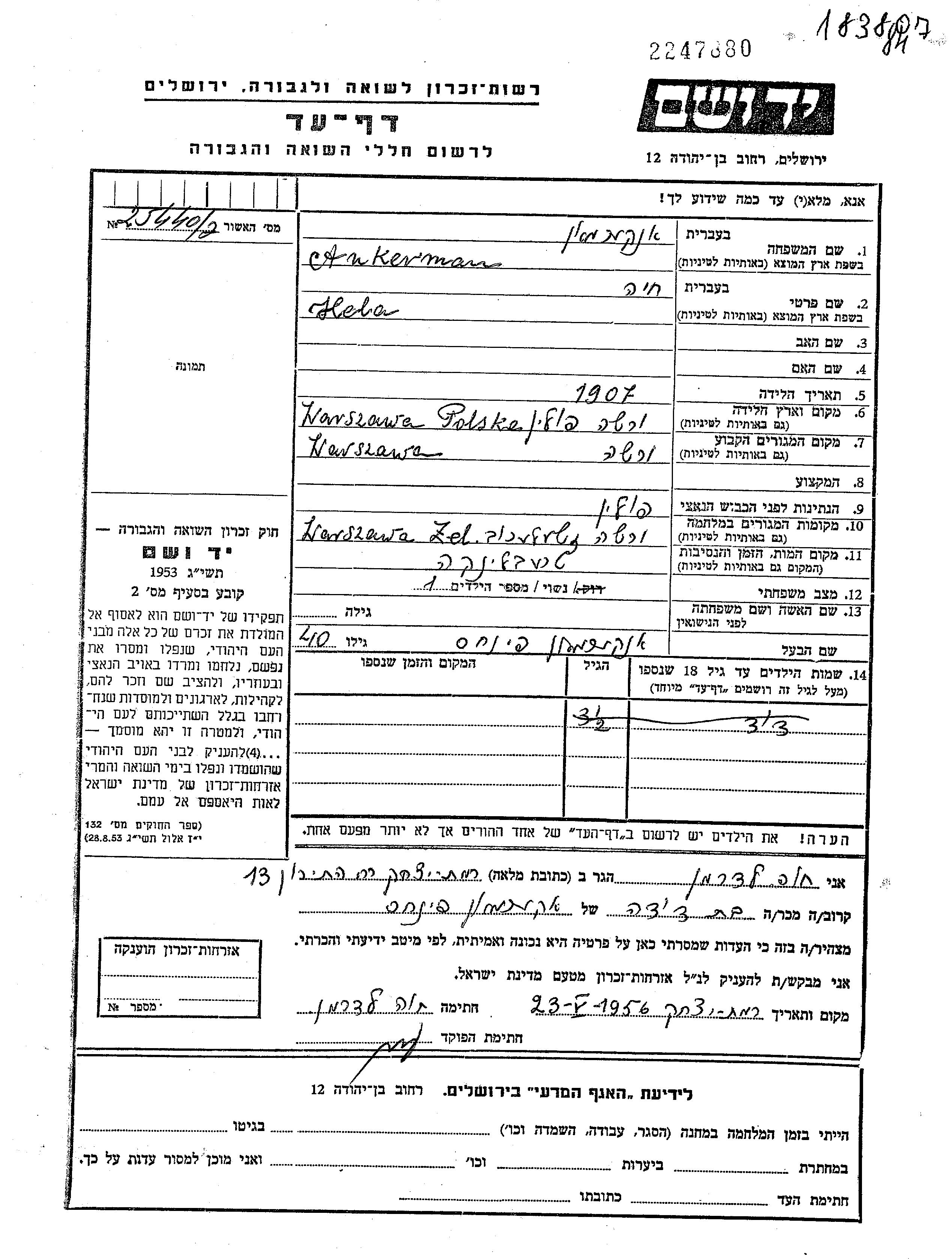 Хела Хая Анкерман, место рождения: Варшава, Польша. Женат / замужем. Место жительства до войны: Варшава, Польша. Место во время войны: Варшава, Польша.