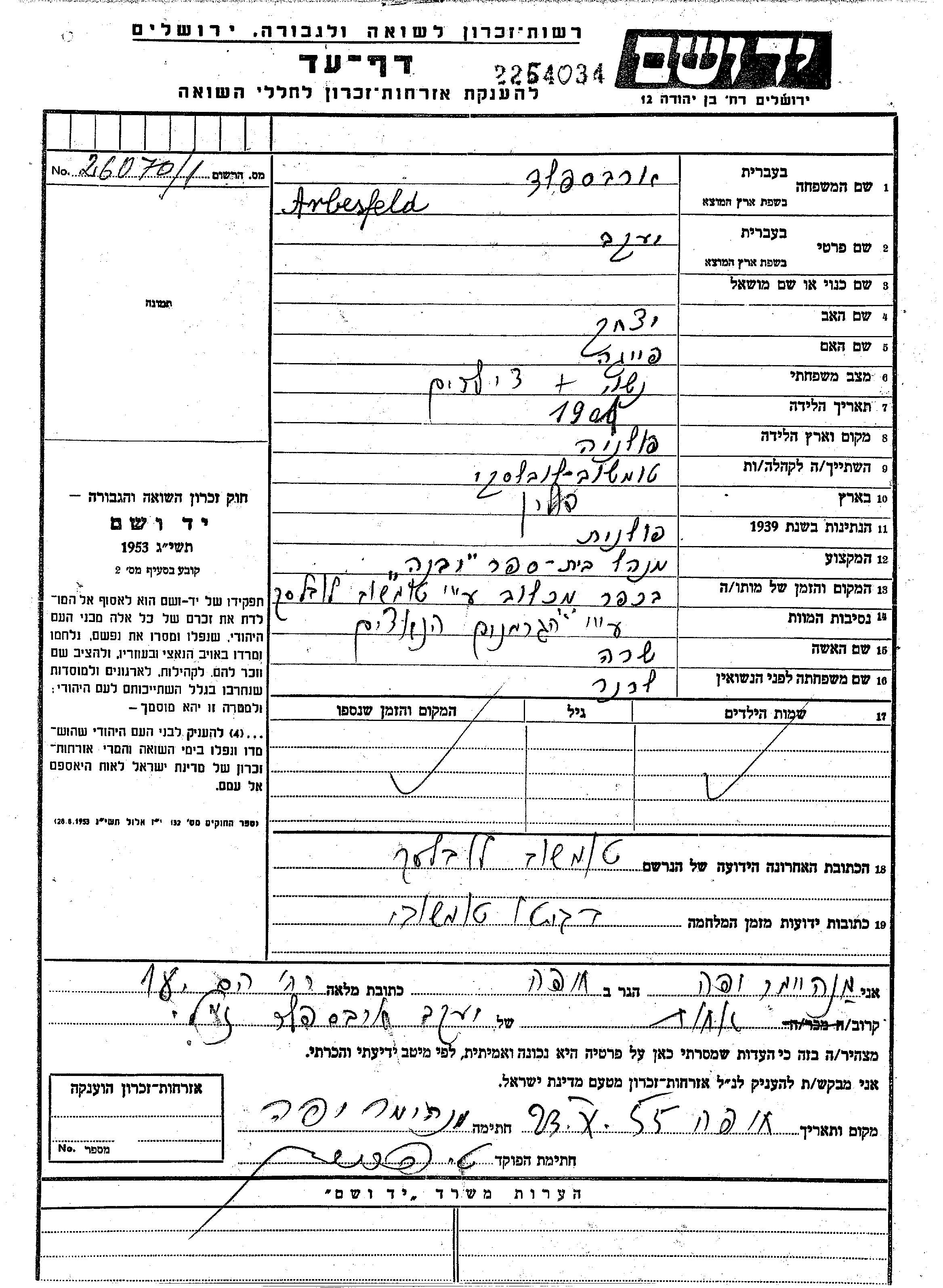 Яков Арбесфельд, место рождения: Польша. Отец: Ицхак, mать:Фейга. Директор школы. Женат / замужем. Место жительства до войны: Томашув, Польша. Место во время войны: Михайка, Чехословакия.