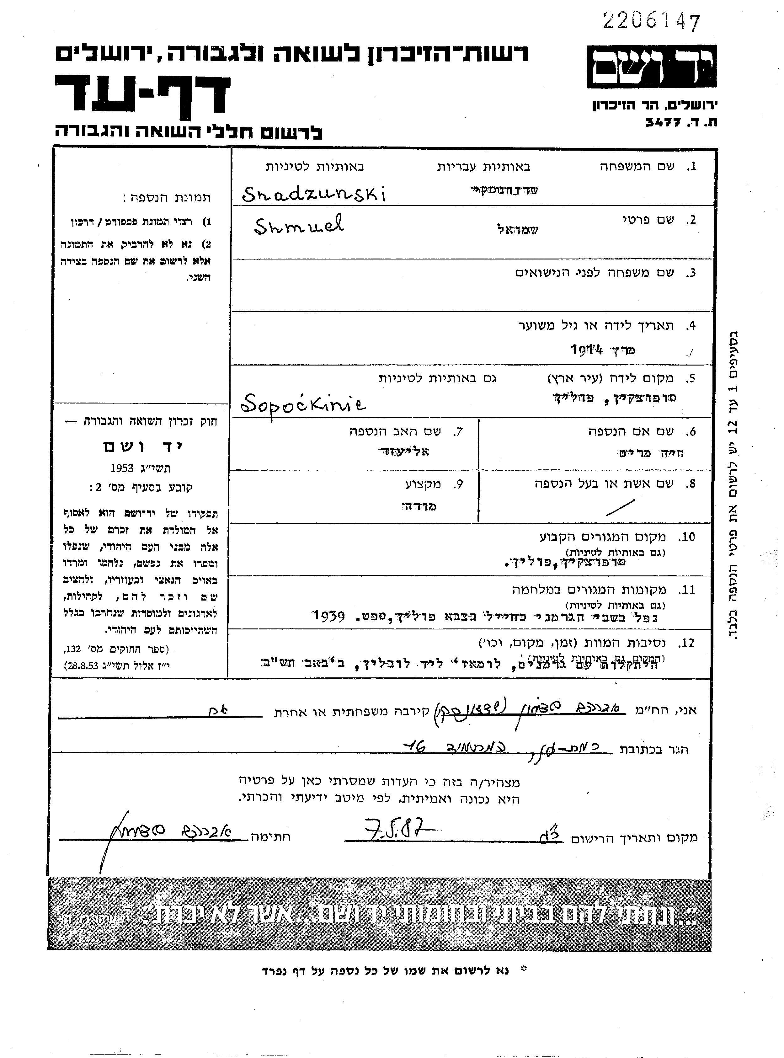 Шамуэль Шадзунски, место рождения: Сопоцкин, Польша. Отец: Элиэзер, mать:Мирьям. Учитель / учительница. Холост / не замужем. Место жительства до войны: Сопоцкин, Польша. Место во время войны: Вооруженные силы Польши.