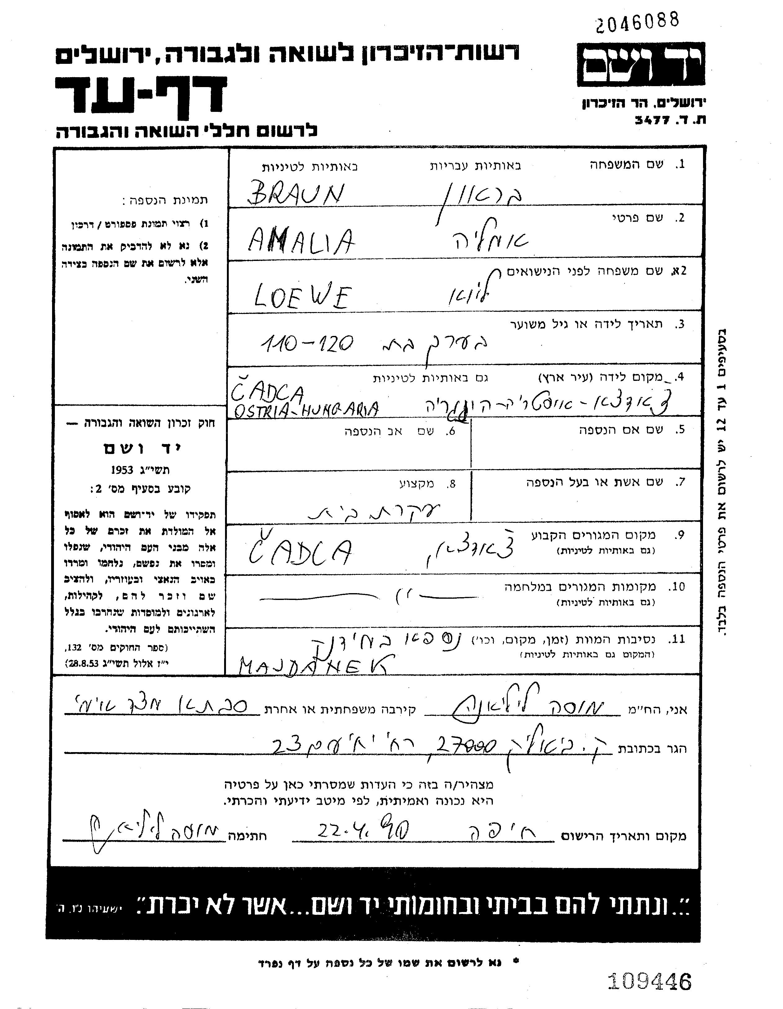 Браун Амалия Чадца, Чехословакия Лист свидетельских показаний