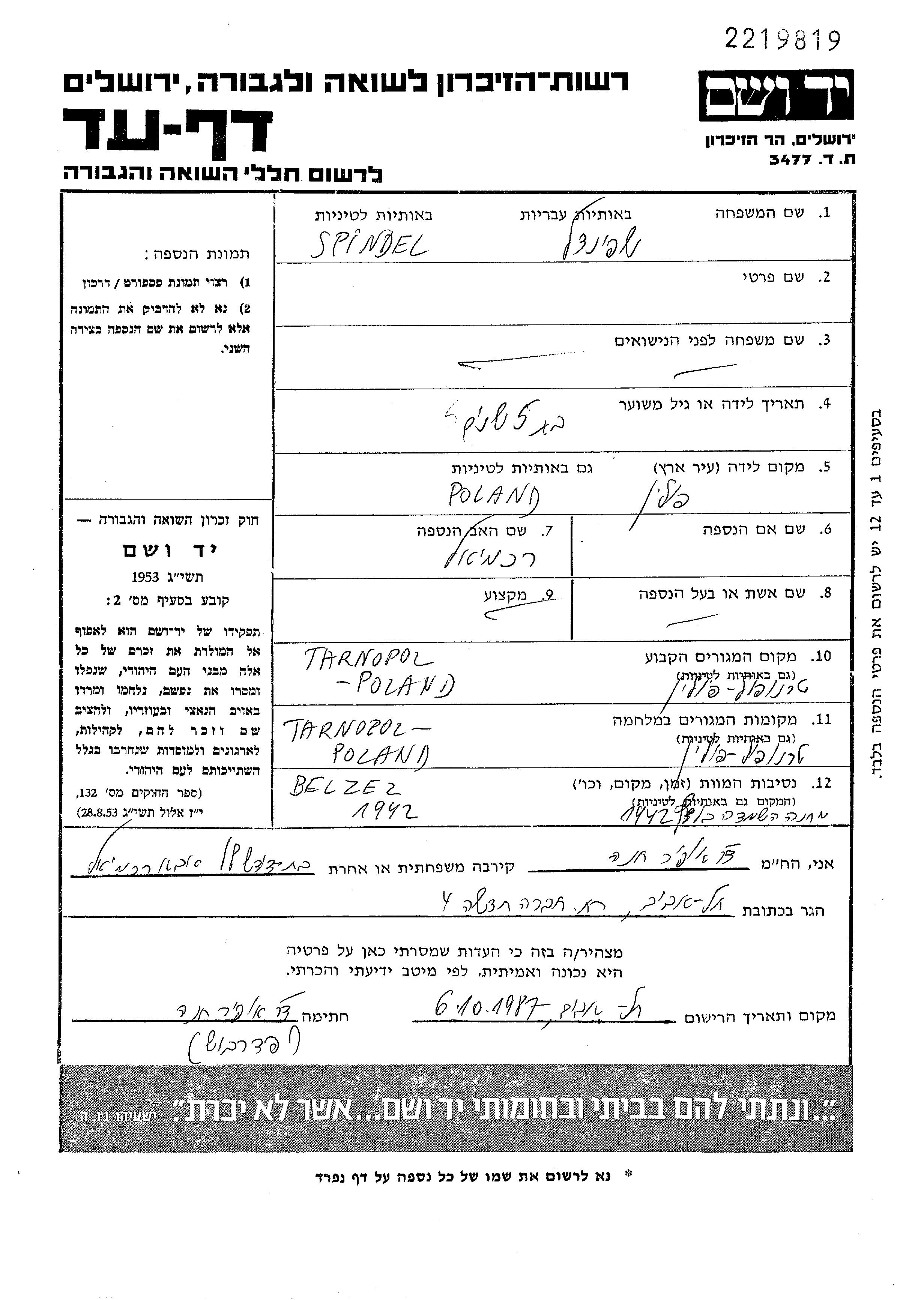Шпиндель Имя неизвестно Тарнополь, Польша Лист свидетельских показаний