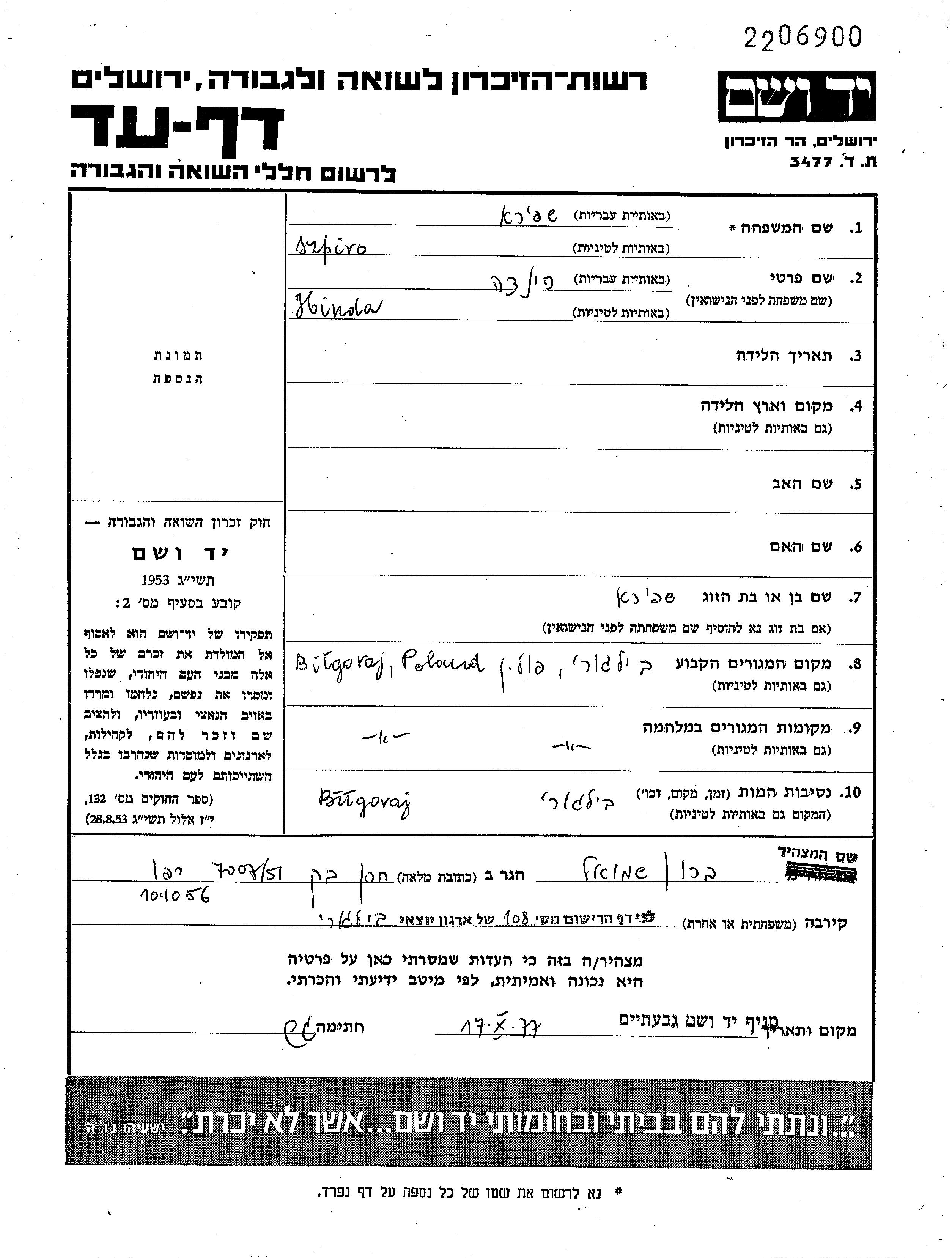 Шпиро Хинда место не указано, Лист свидетельских показаний