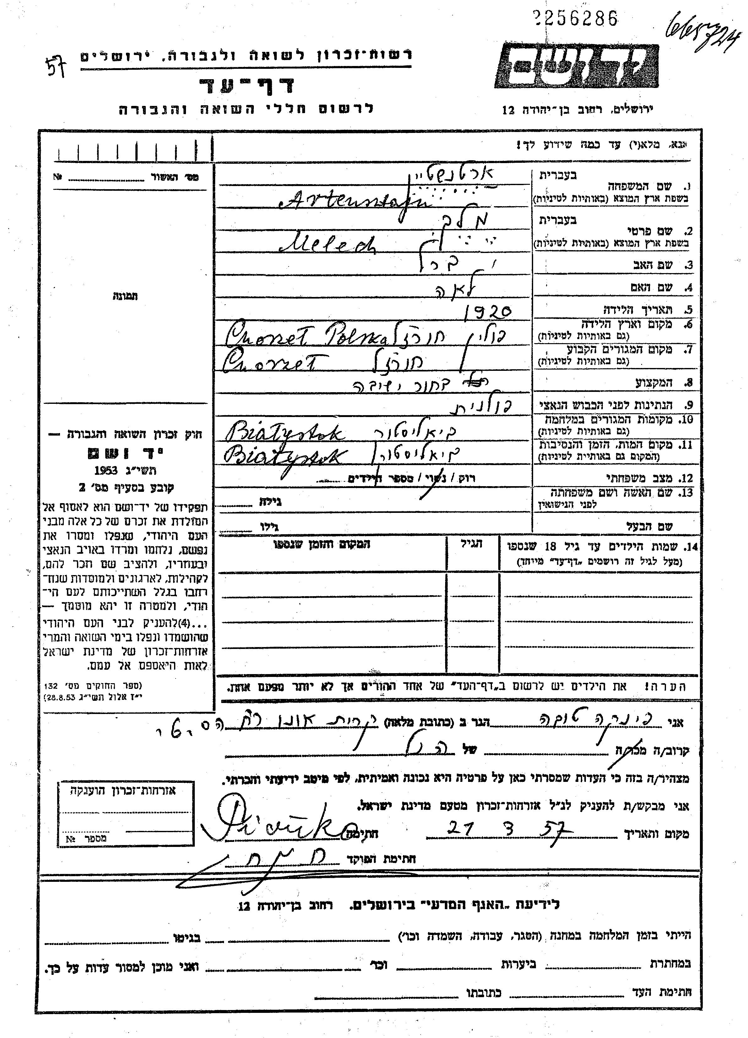 Мелех Артенштайн, место рождения: Хожеле, Польша. Отец: Берл, mать:Лея. Учащийся иешивы. Холост / не замужем. Место жительства до войны: Хожеле, Польша. Место во время войны: Белосток, Польша.