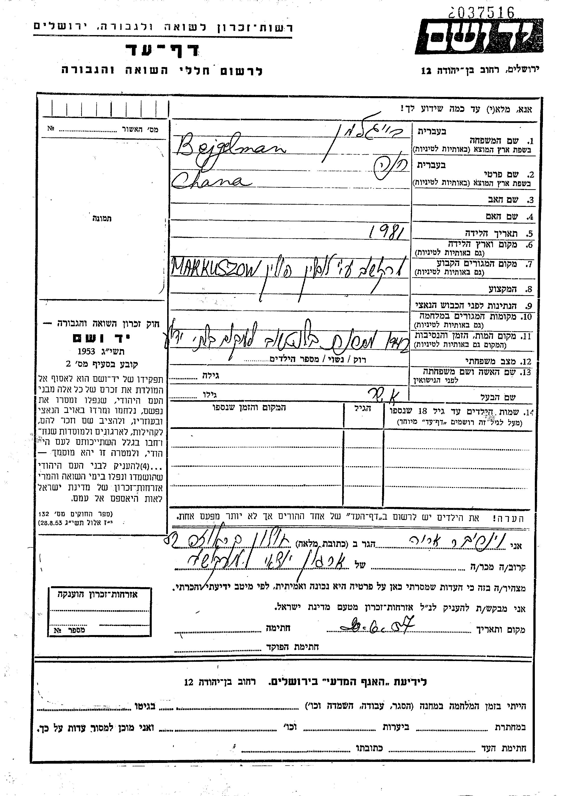 Хана Бейгельман, место рождения: Маркушув, Польша. Женат / замужем.