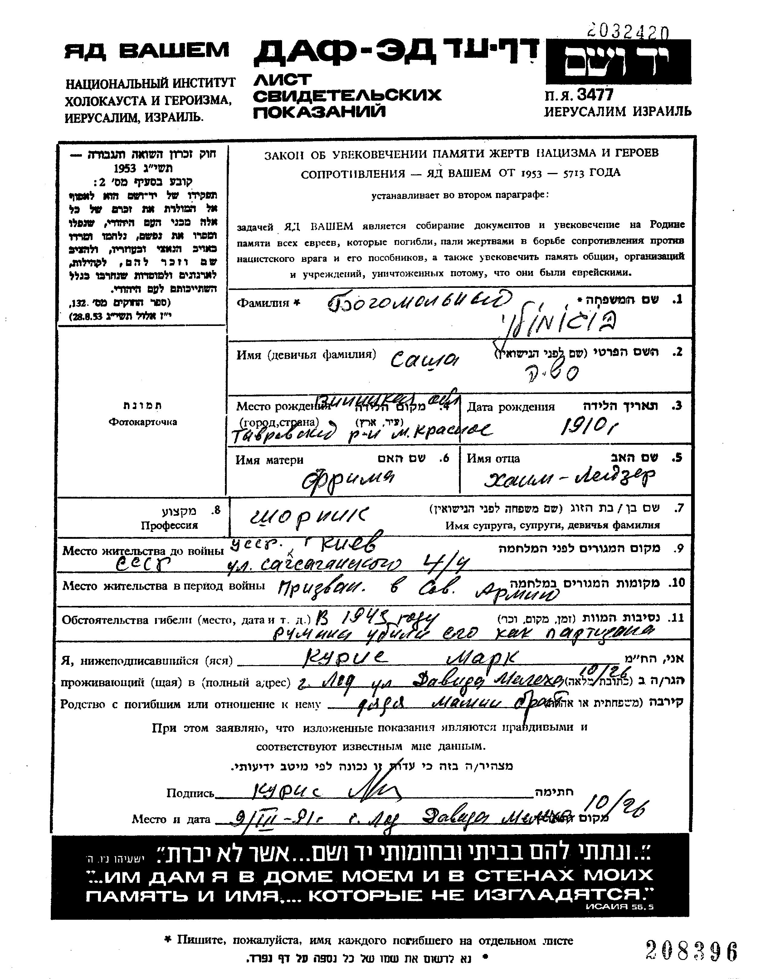 Богомольный Саша 1910 Киев, Украина (СССР) Лист свидетельских показаний