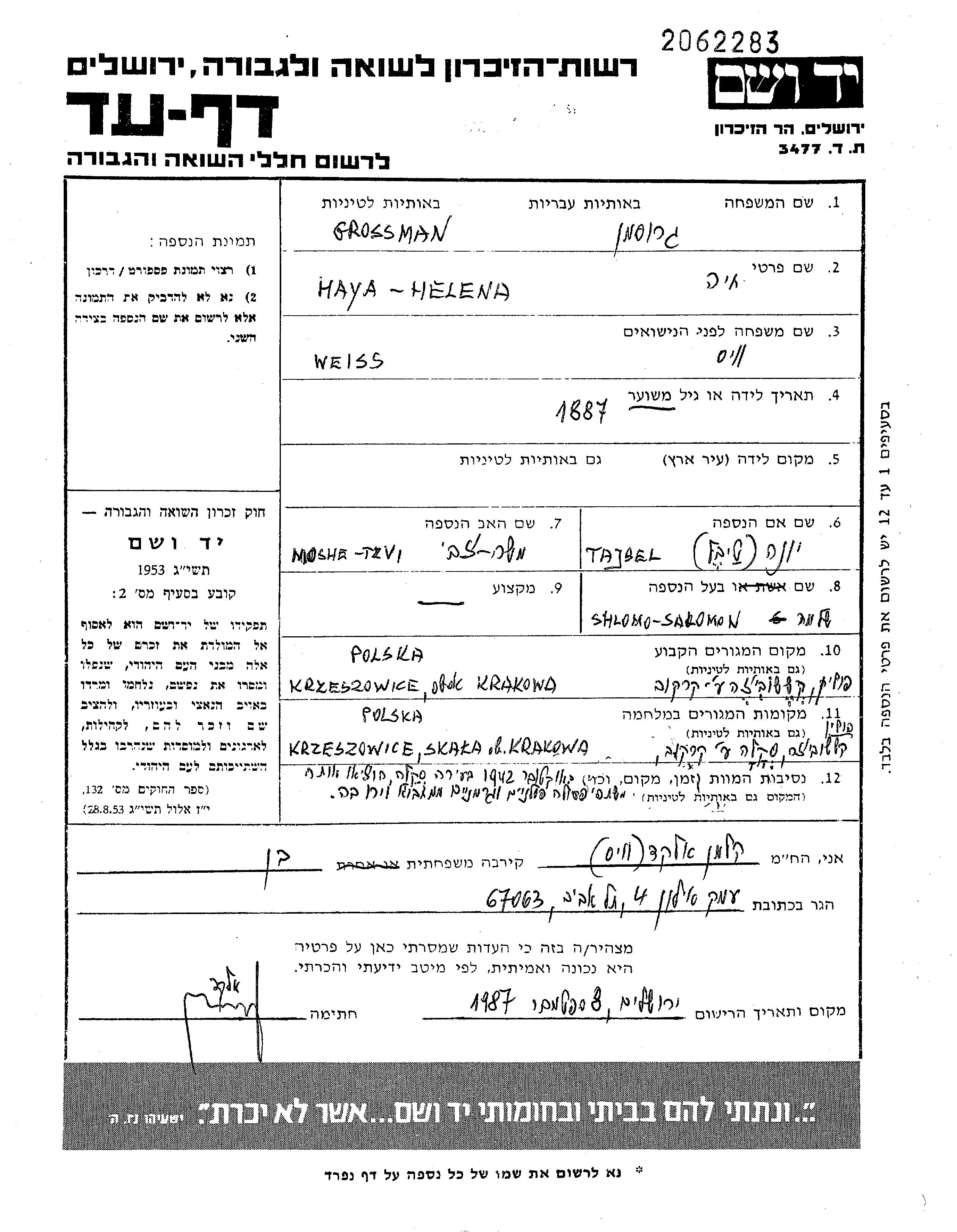 Хая Хелена Гроссман, девичья фамилия Вайсс. Отец: Моше Цви, mать:Тайбель Иона Тейбель. Женат / замужем. Место жительства до войны: Кшешовице, Польша. Место во время войны: Кшешовице, Польша.