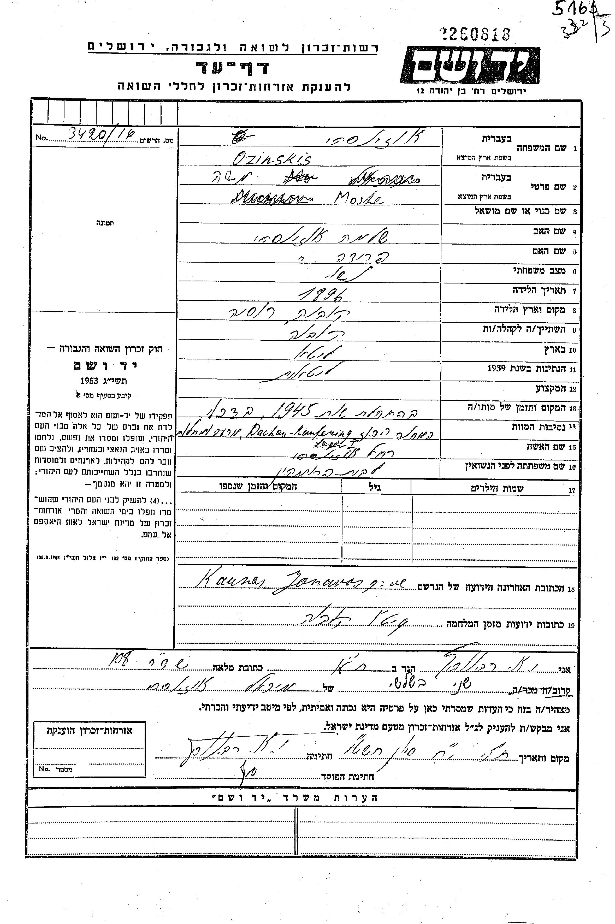 Моше Михаэль Ожинскис, место рождения: Каунас, Литва. Отец: Шломо, mать:Фрида. Женат / замужем. Место жительства до войны: Каунас, Литва. Место во время войны: Каунас, Литва.