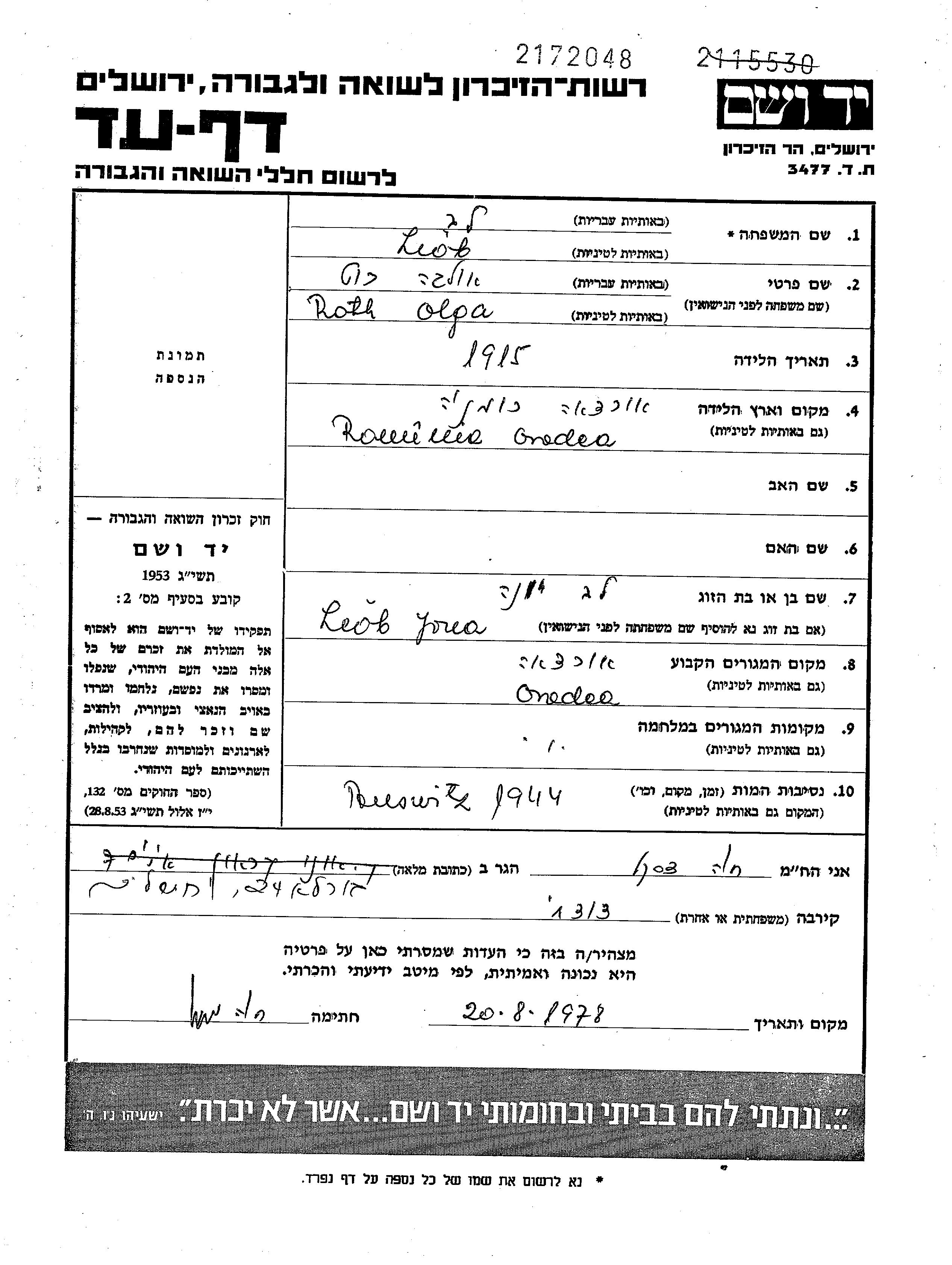 Леоб Лев Ольга 1915 Орадя, Румыния Лист свидетельских показаний