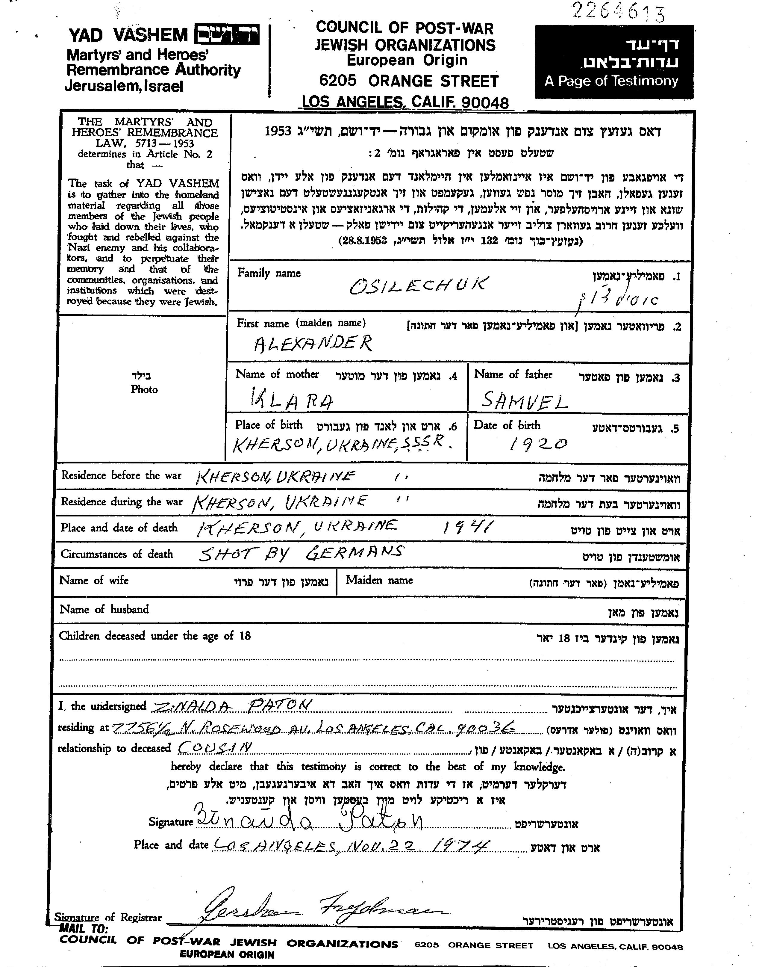 Осилечук Александер 1920 Херсон, Украина (СССР) Лист свидетельских показаний