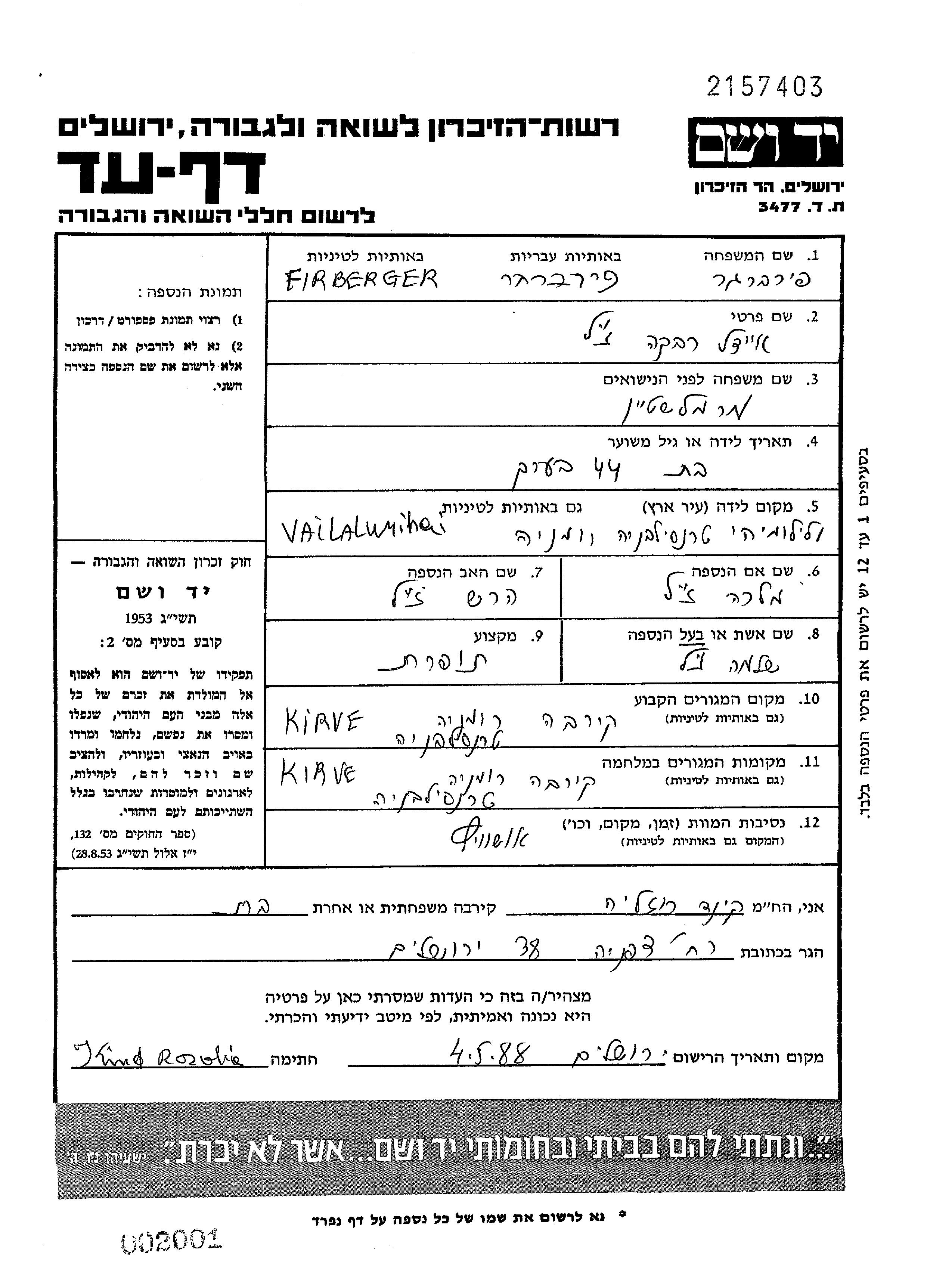 Эйдл Ривка Фирбергер, девичья фамилия Мермельштейн, место рождения: Валя-Луй-Михай, Румыния. Отец: Герш, mать:Малка. Швея. Женат / замужем. Место жительства до войны: Кирва, Румыния. Место во время войны: Кирва, Румыния.