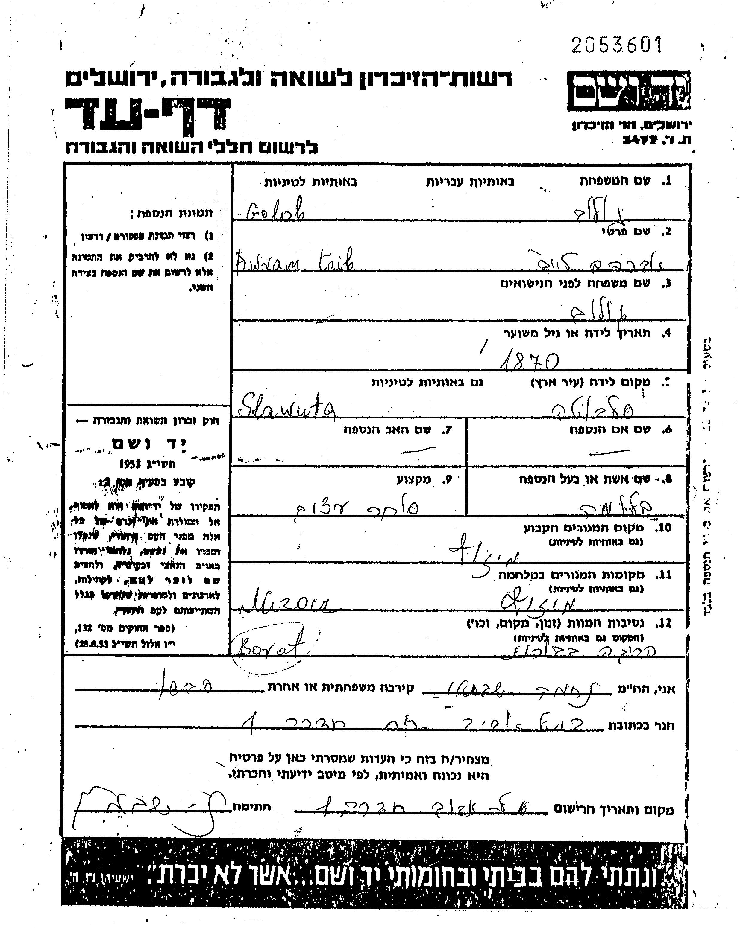 Аврам Лейб Голоб, место рождения: Славута, Украина (СССР). Торговец / торговка. Женат / замужем. Место жительства до войны: Мизоч, Польша. Место во время войны: Мизоч, Польша.