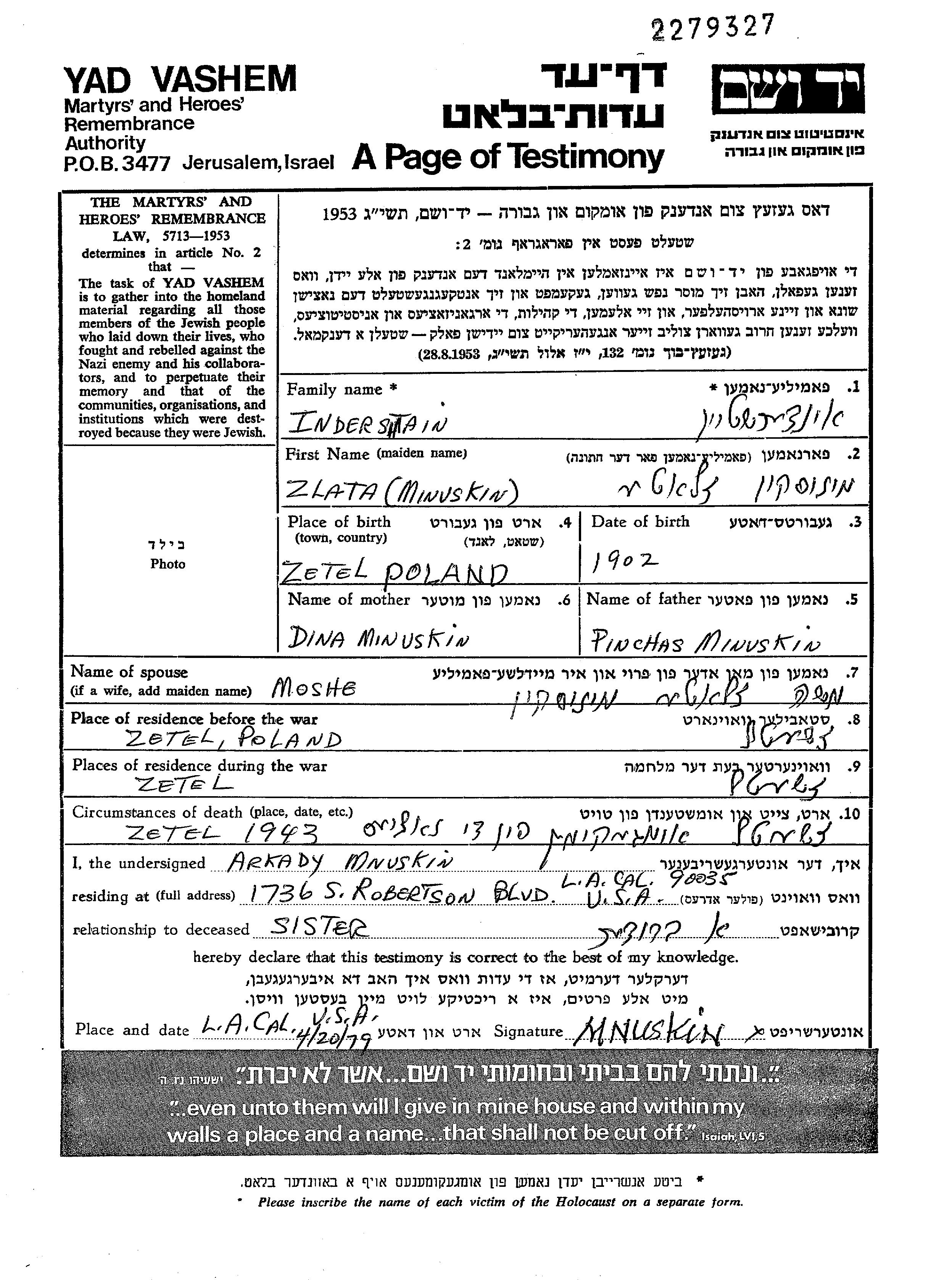 Злата Индерштайн, девичья фамилия Минускин, место рождения: Дзенцел, Польша. Отец: Пинхас, mать:Дина. Женат / замужем. Место жительства до войны: Дзенцел, Польша. Место во время войны: Дзенцел, Польша.