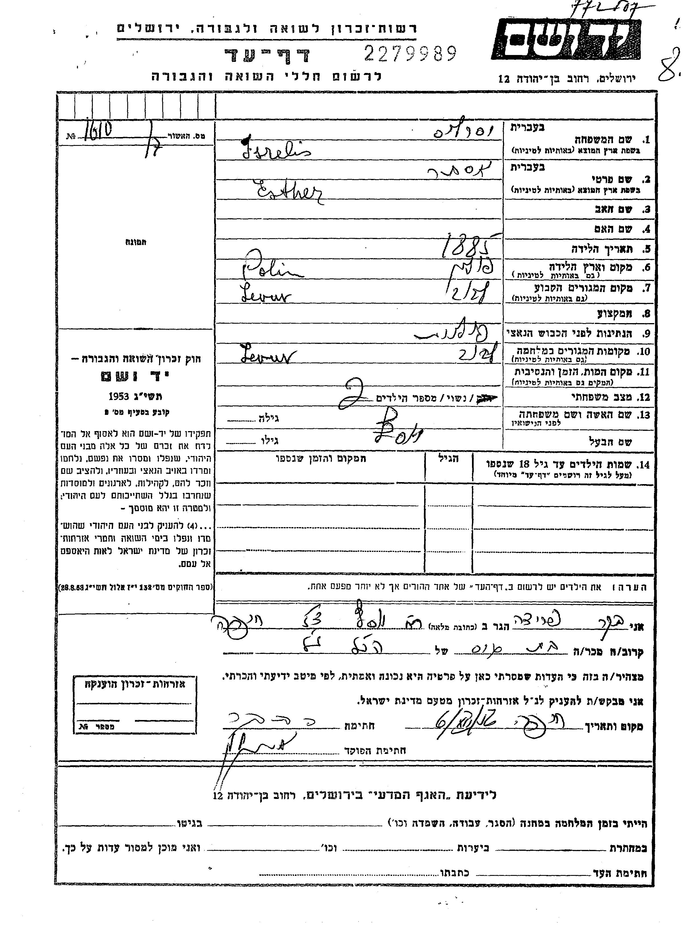 Исрелис Эстер 1885 Львов, Польша Лист свидетельских показаний