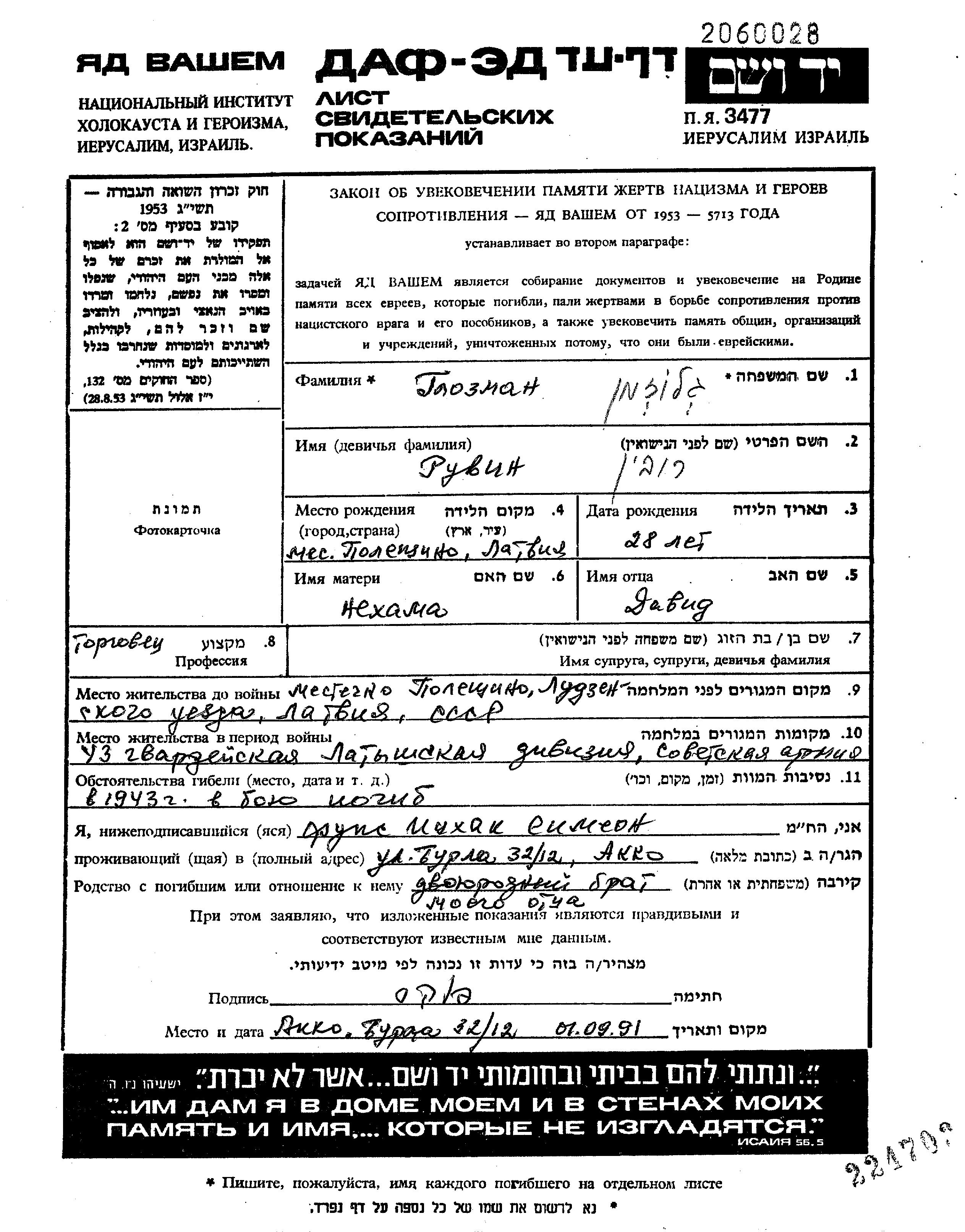 Рувин Глозман, место рождения: Полещино, Латвия. Отец: Давид, mать:Нехама. Торговец / торговка. Место жительства до войны: Полещино, Латвия. Место во время войны: Вооруженные силы Советского Союза. Рувин погиб на военной службе. место смерти: неизвестно в 1943.