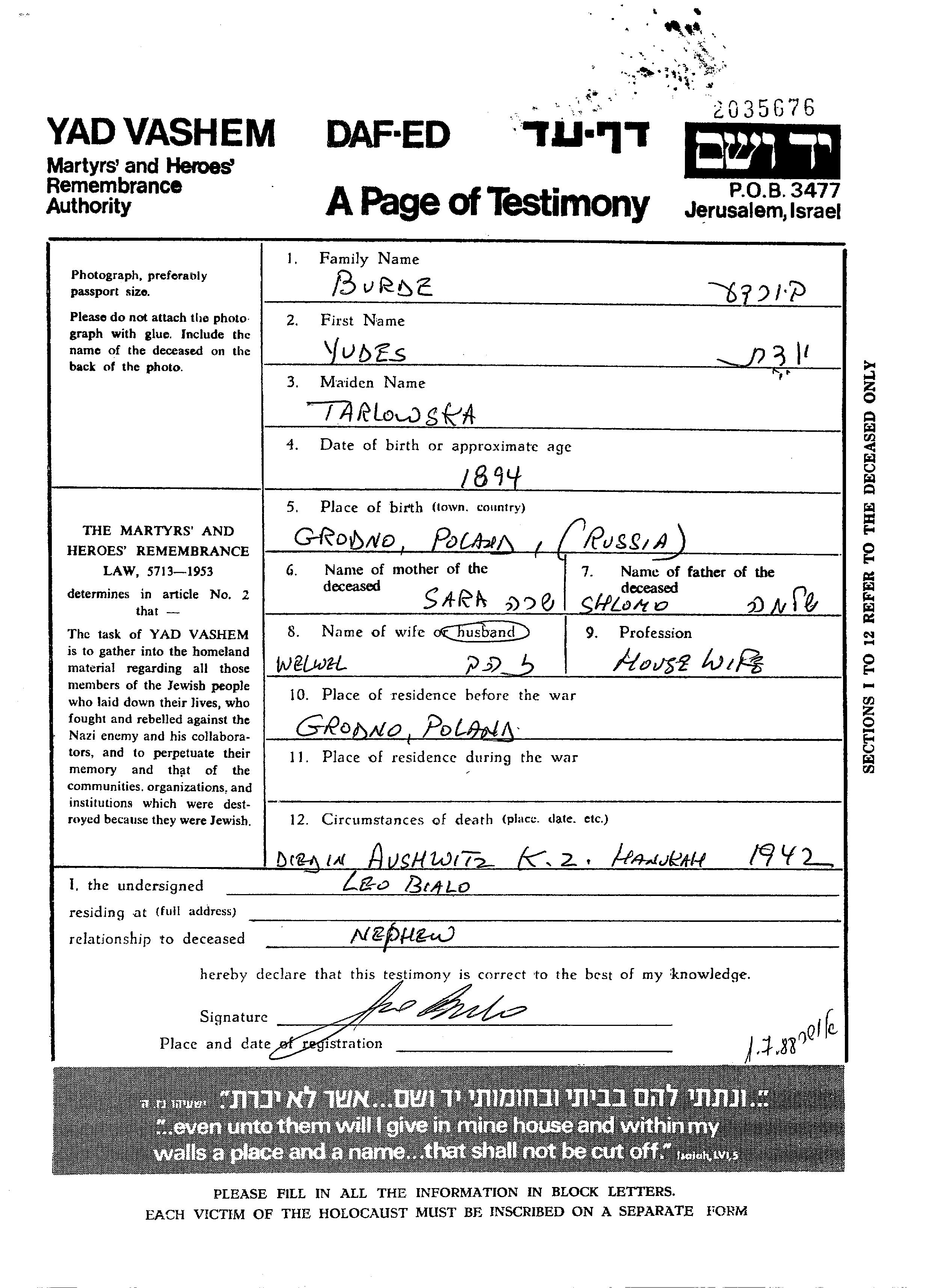 Иегудит Бурде, девичья фамилия Тарловски, место рождения: Гродно, Польша. Отец: Шломо, mать:Сара. Домохозяйка. Женат / замужем. Место жительства до войны: Гродно, Польша.