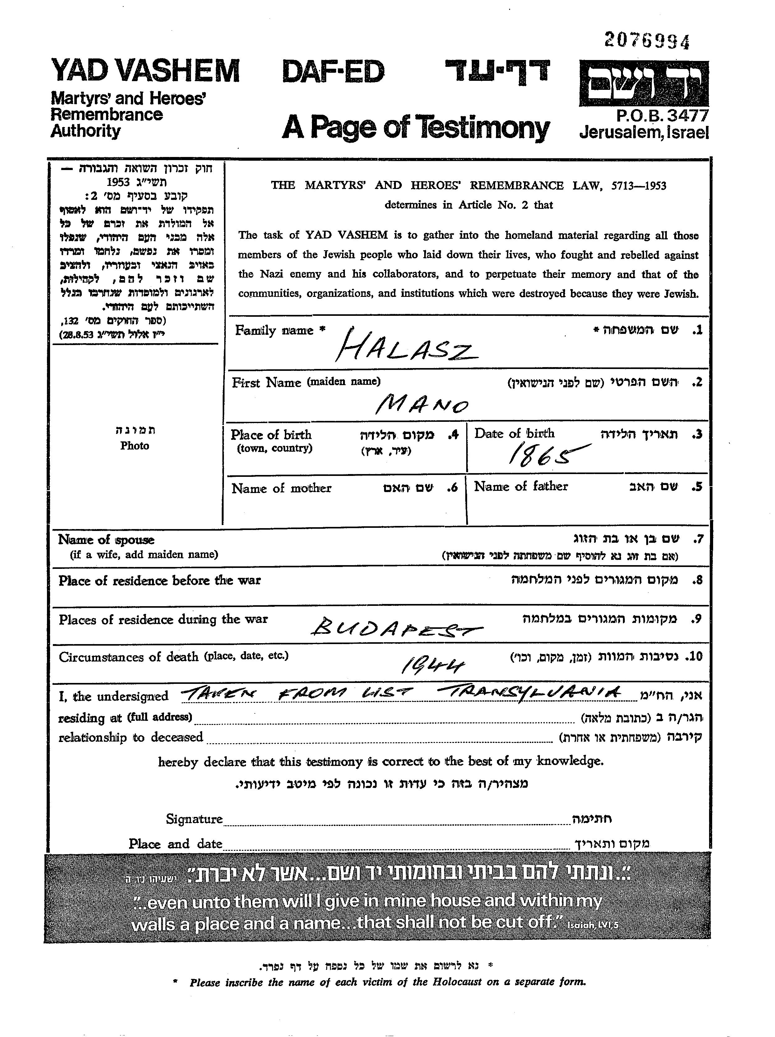 Яд Вашем - Листы свидетельских показаний Мемориального фонда