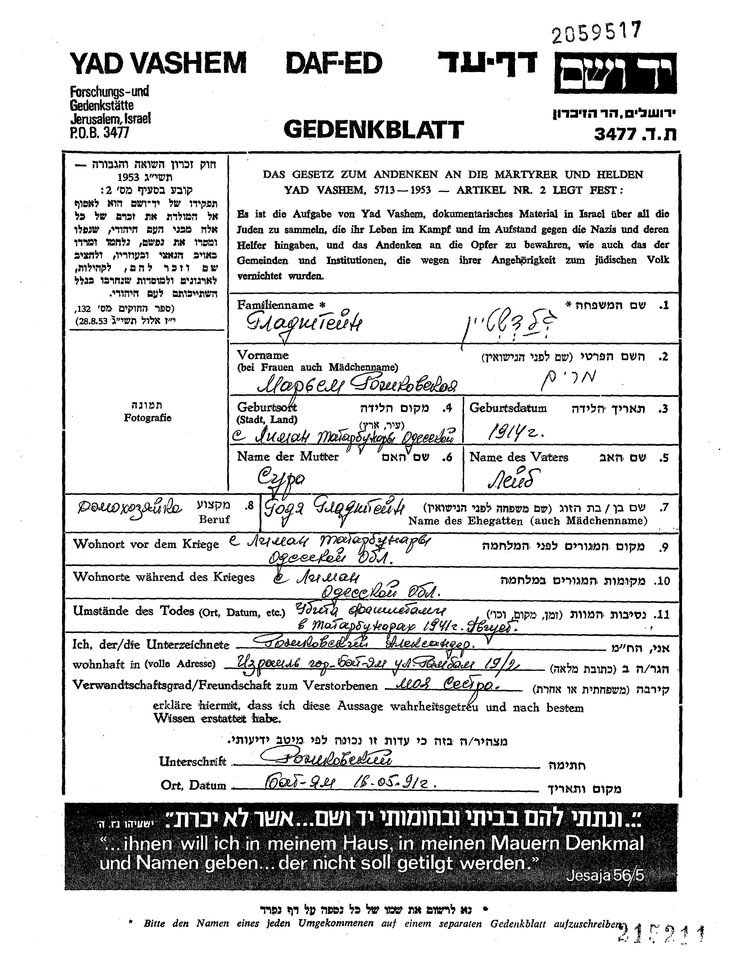 Яд Вашем - Листы свидетельских показаний Мемориального фонда
