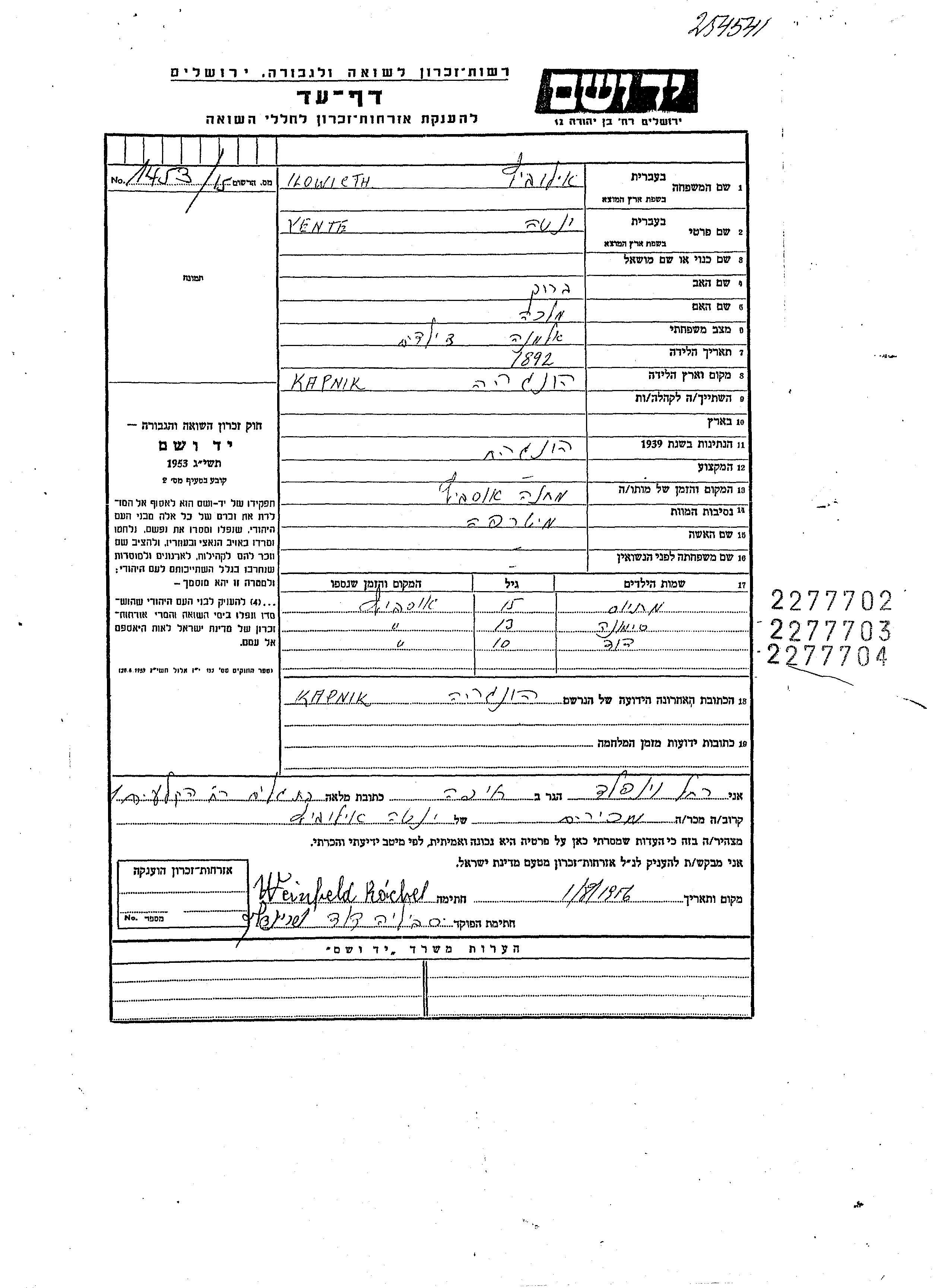 Яд Вашем - Листы свидетельских показаний Мемориального фонда