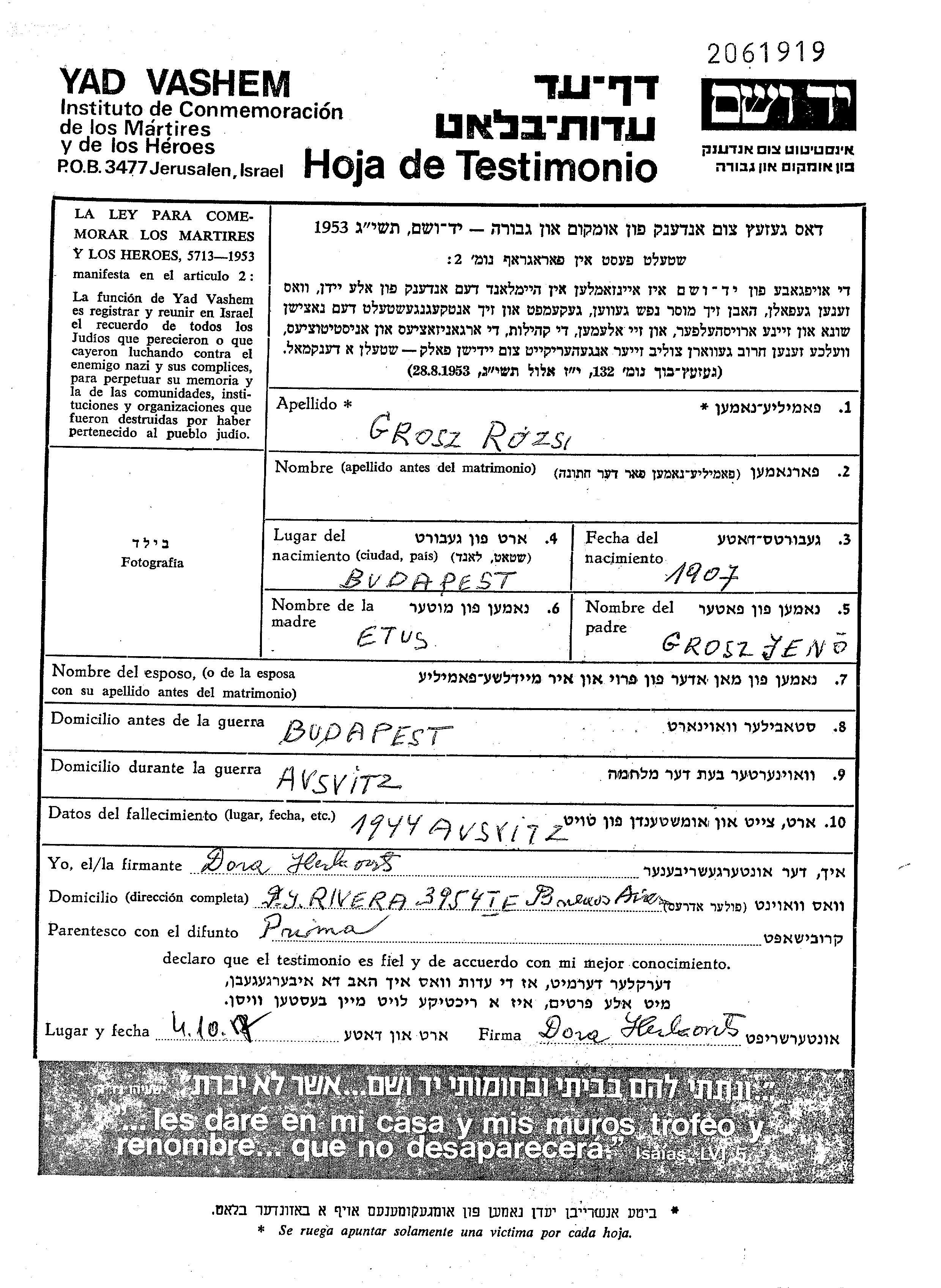 Рожи Грос, место рождения: Будапешт, Венгрия. Отец: Ено, mать:Этуш. Место жительства до войны: Будапешт, Венгрия.