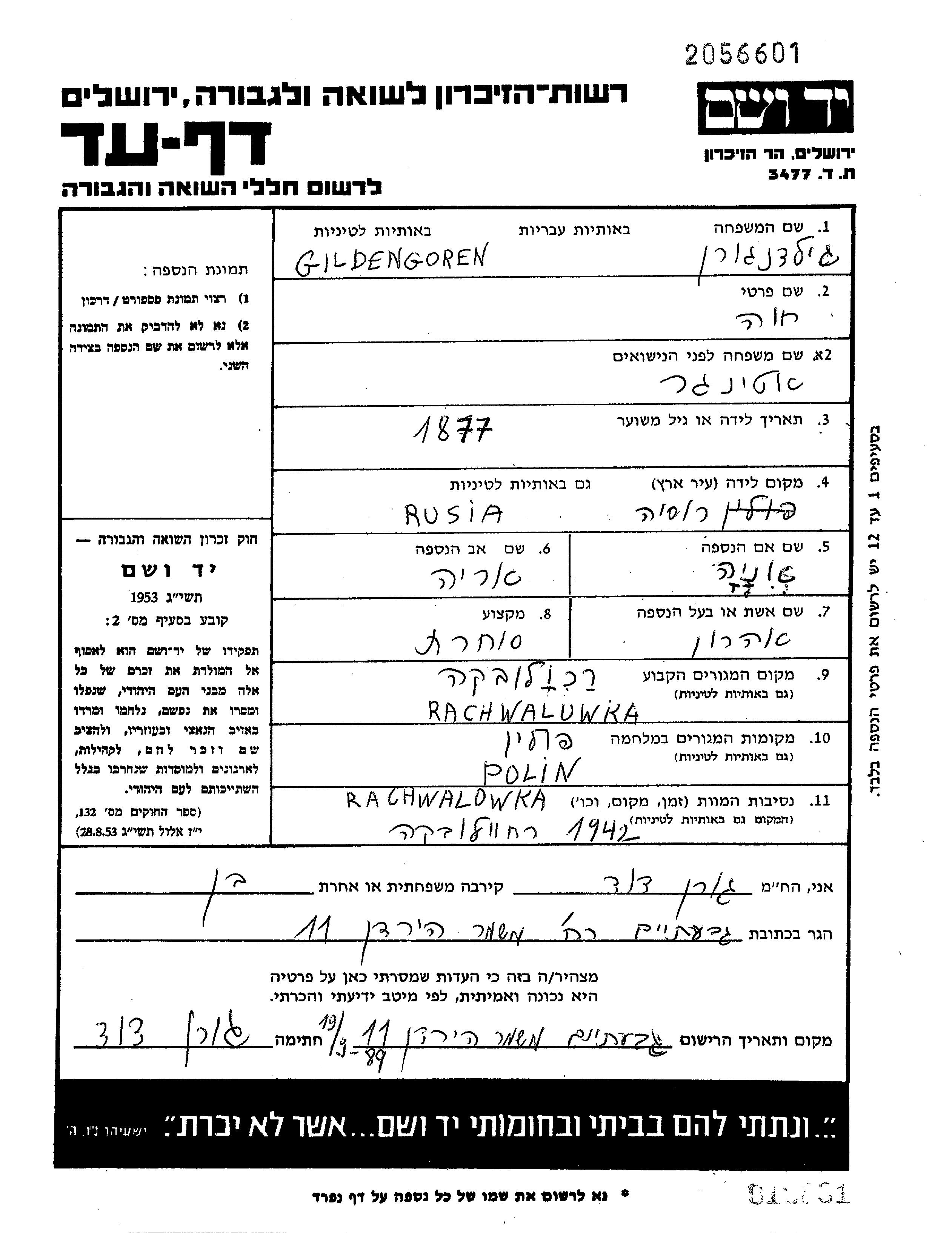 Гильденгорен Хава 1877 Рафаловка, Польша Лист свидетельских показаний