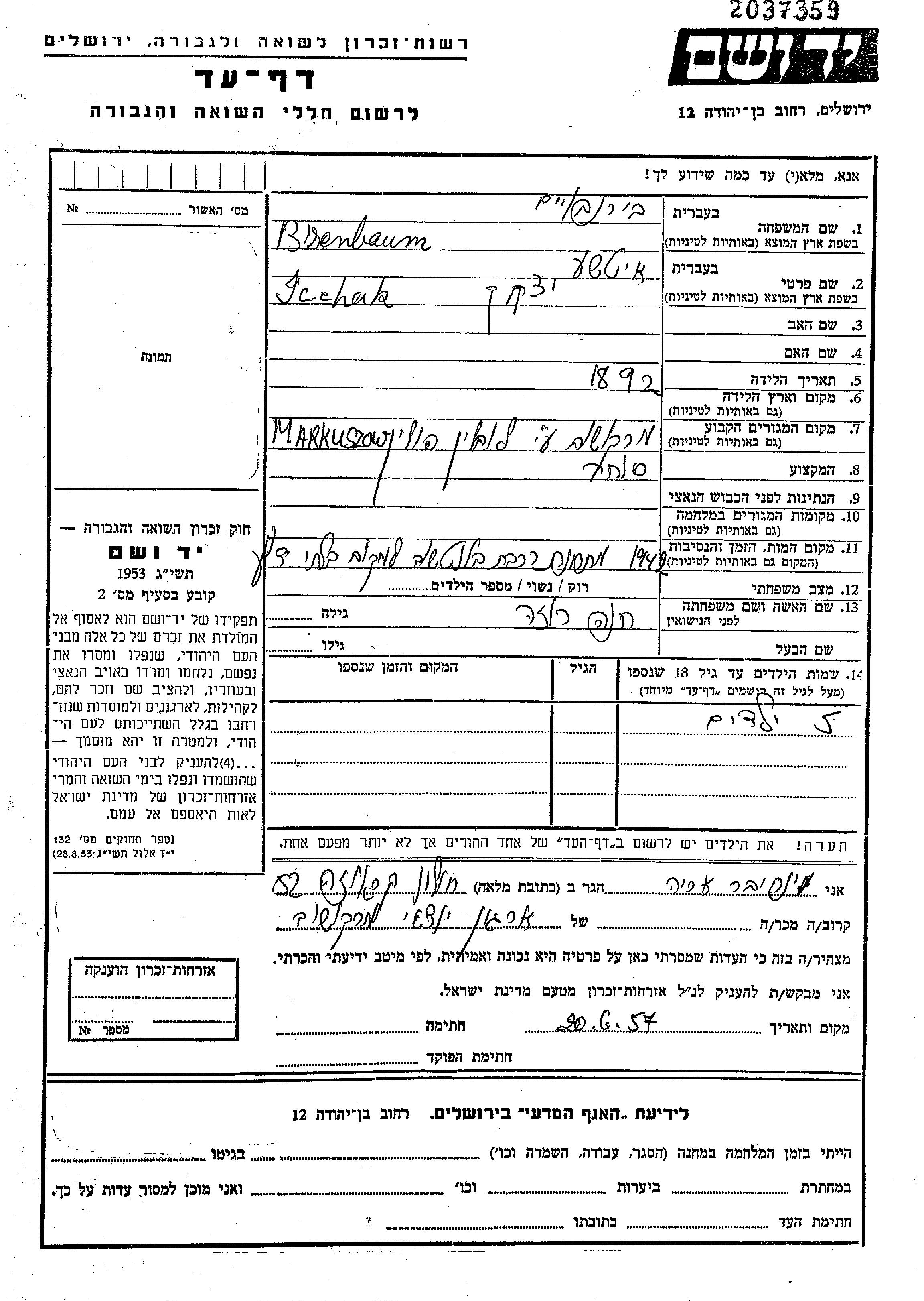 Иче Биренбаум. Торговец / торговка. Женат / замужем. Место жительства до войны: Маркушув, Польша.