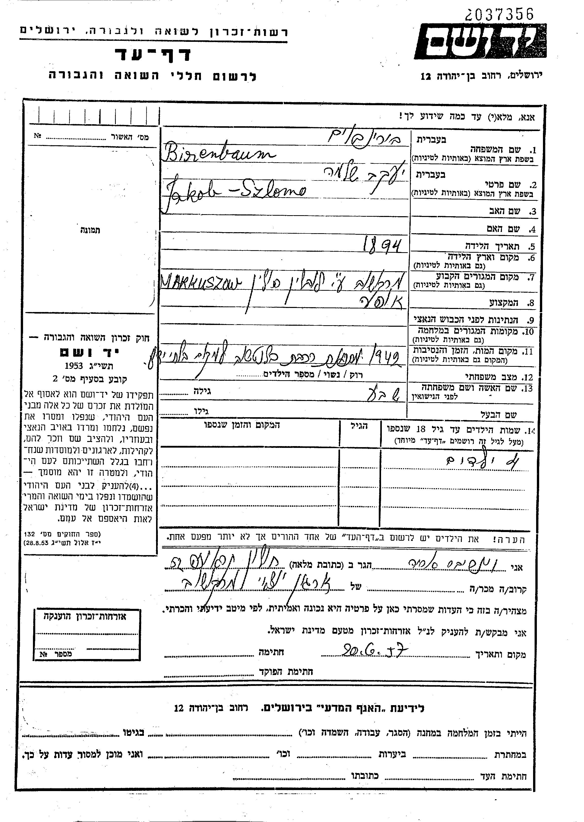 Биренбаум Якоб Шломо 1894 Маркушув, Польша Лист свидетельских показаний