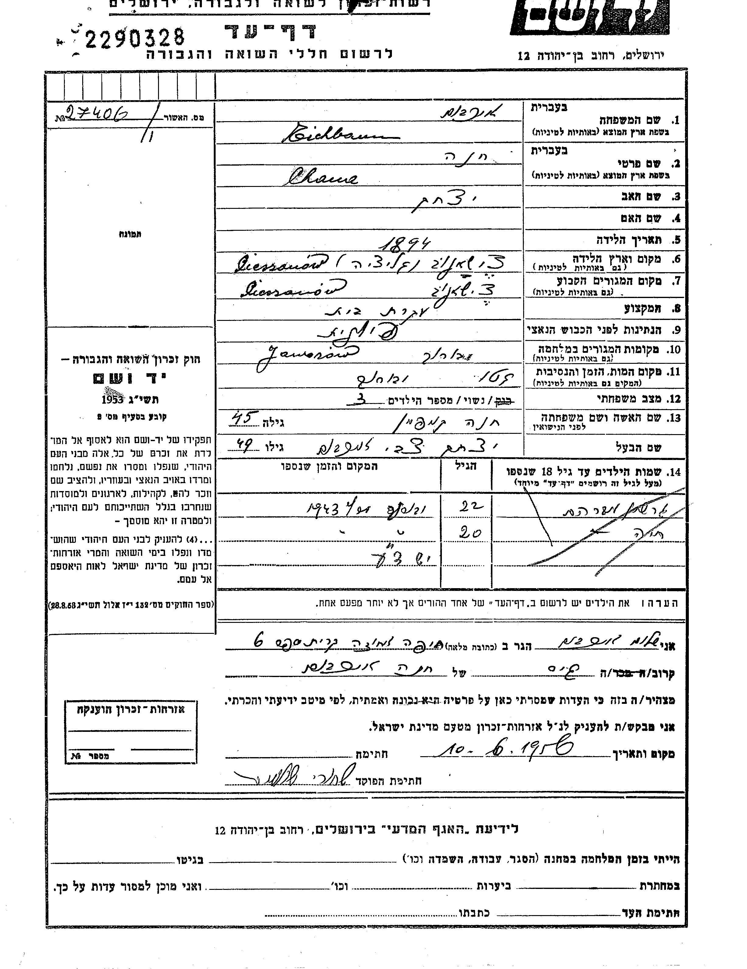 Хана Айхбаум, девичья фамилия Койфман, место рождения: Цешанув, Польша. Отец: Ицхак. Домохозяйка. Женат / замужем. Место жительства до войны: Цешанув, Польша. Место во время войны: Яворов, Польша.