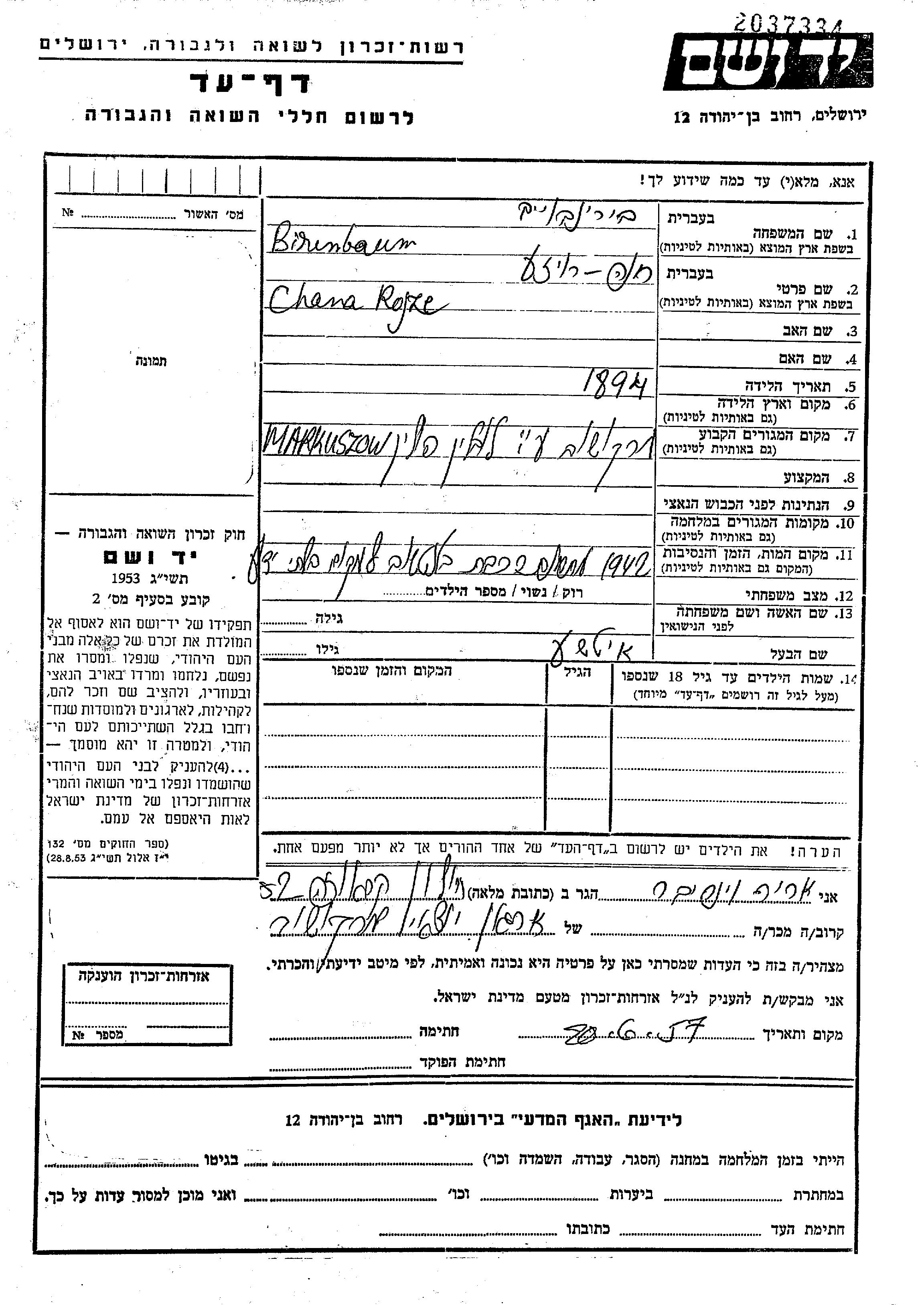 Бирнбаум Хана Ройзе 1894 Маркушув, Польша Лист свидетельских показаний