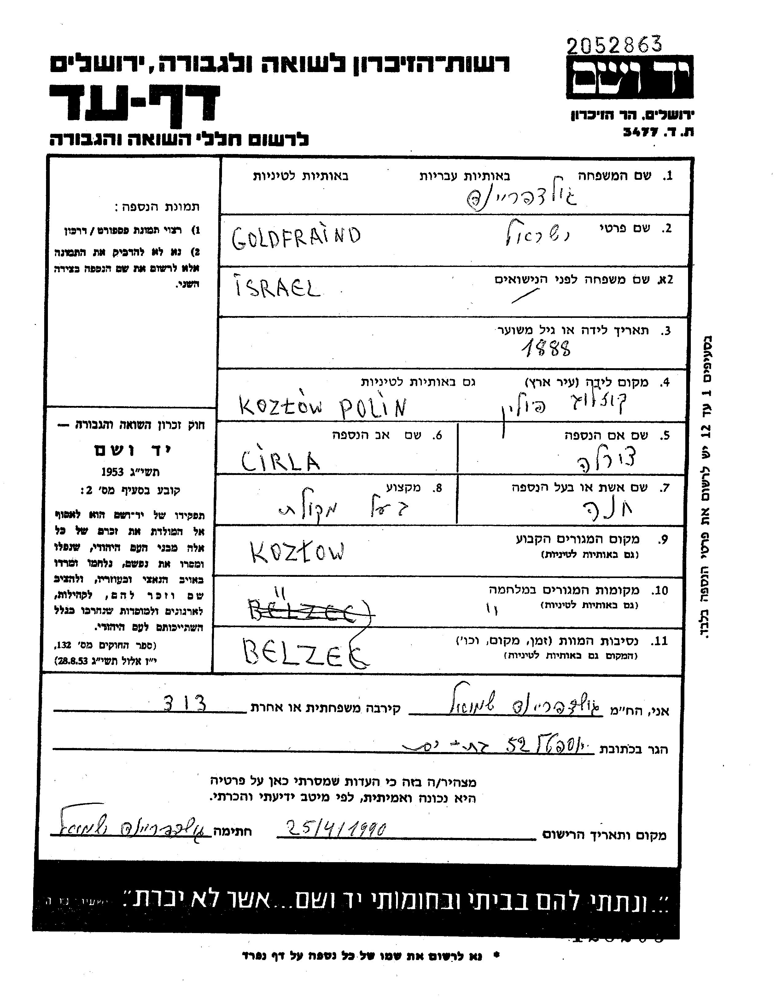 Исраэль Гольдфрайнд, место рождения: Козлов, Польша.Mать:Цирла. Владелец / владелица магазина. Женат / замужем. Место жительства до войны: Козлов, Польша. Место во время войны: Козлов, Польша.