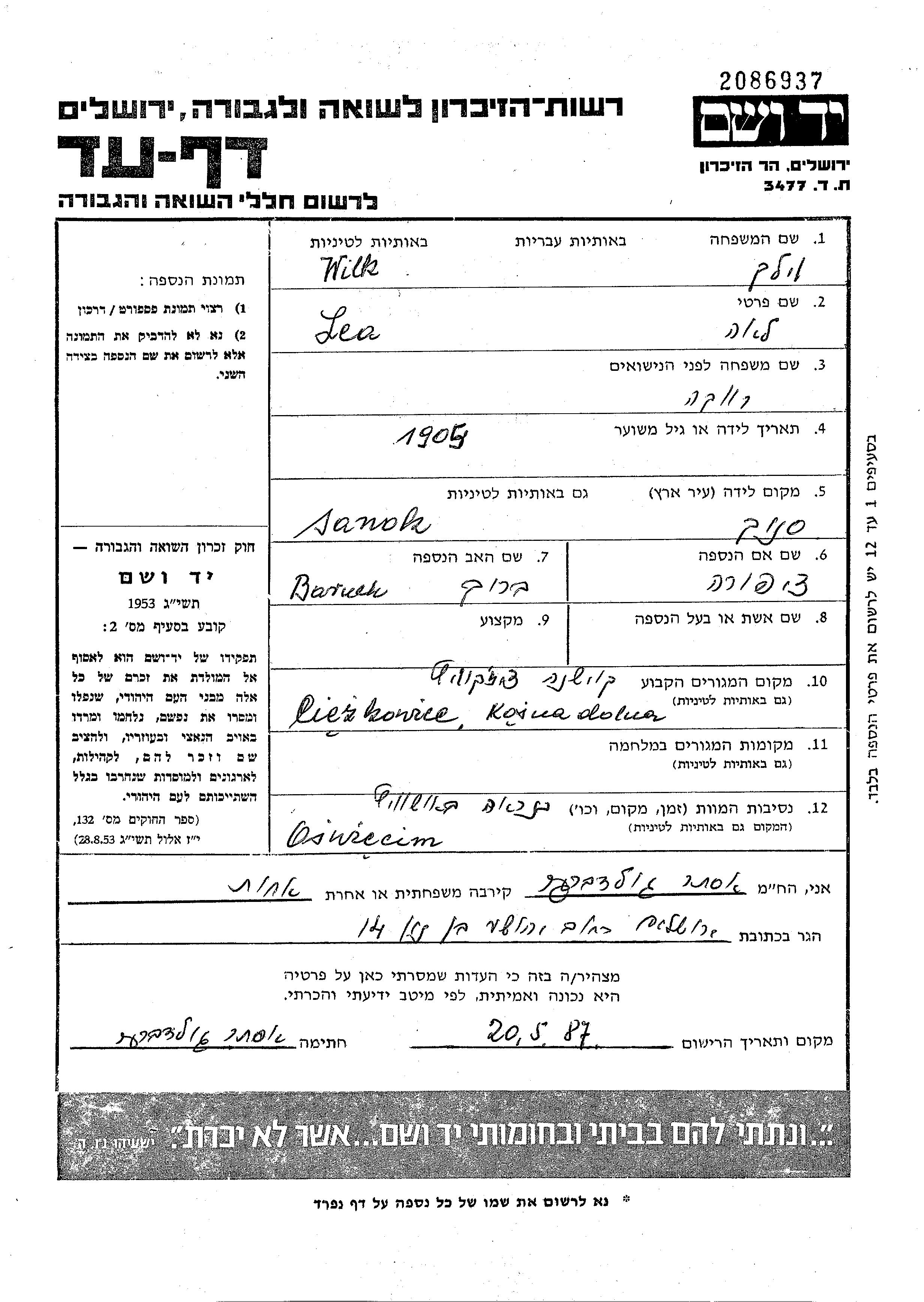 Лея Вильк, место рождения: Санок, Польша. Отец: Барух, mать:Ципора. Холост / не замужем. Место жительства до войны: Ценжковице, Польша.