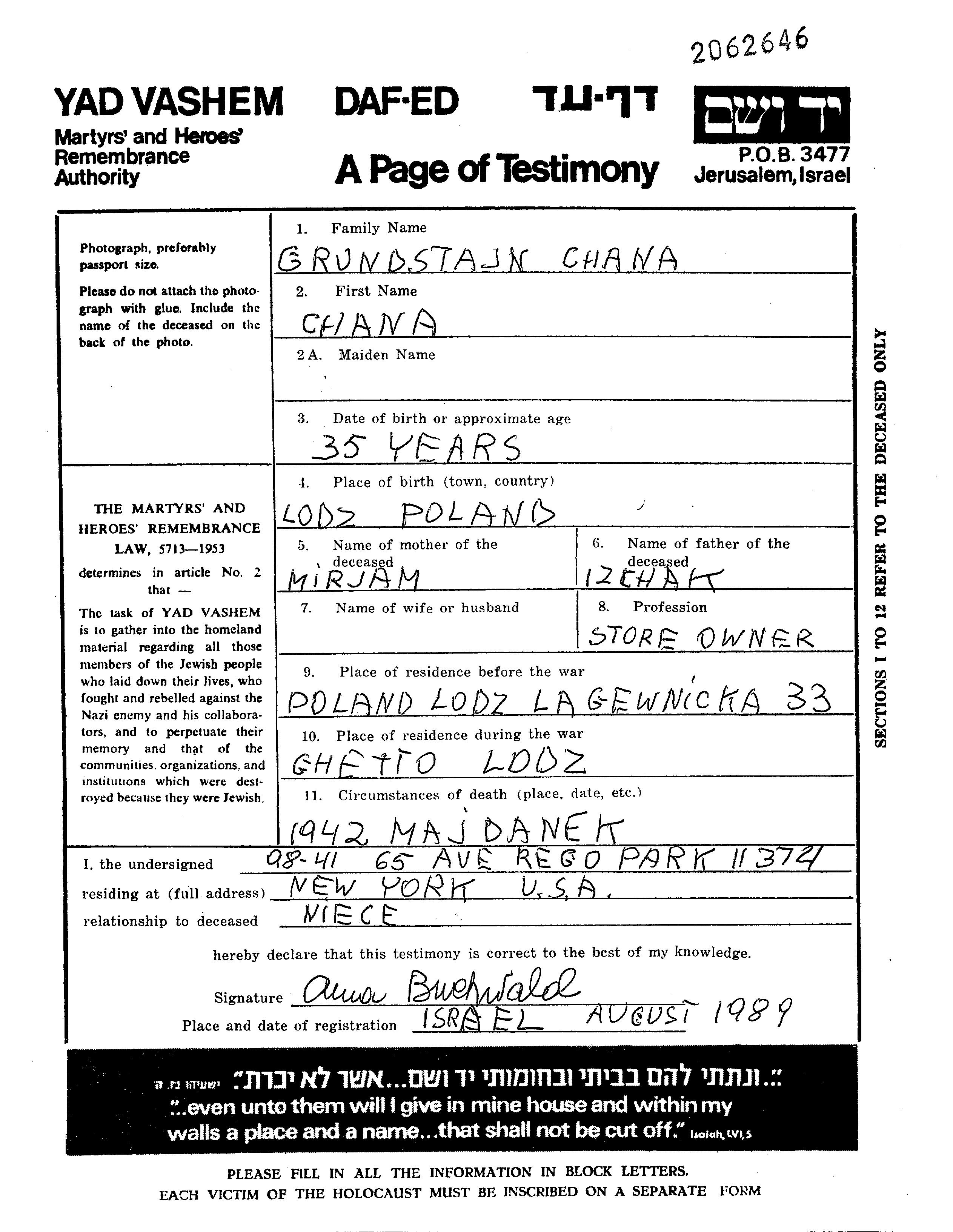 Грундштайн Хана 1907 Лодзь, Польша Лист свидетельских показаний
