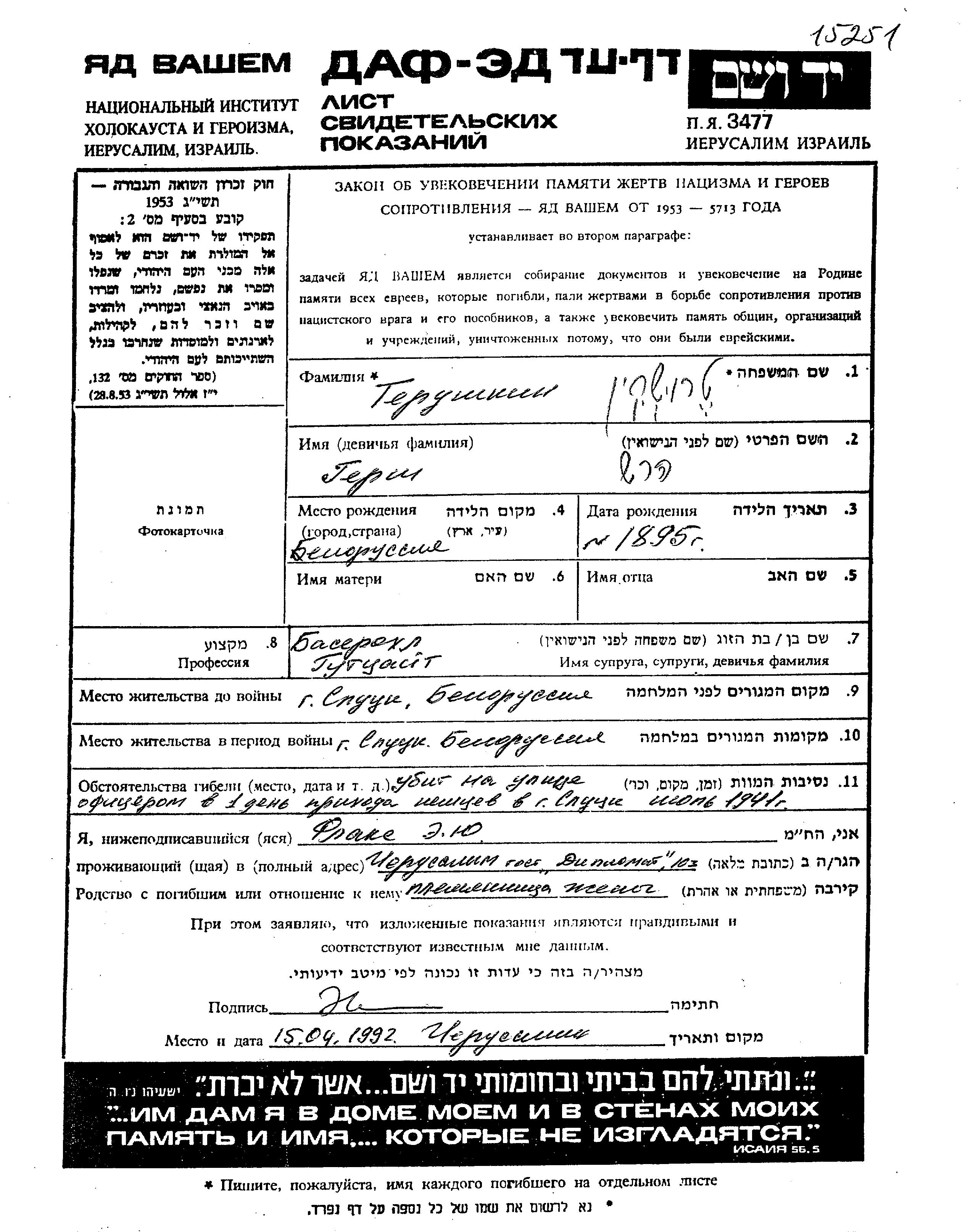 Терушкин Герш 1895 Слуцк, Белоруссия (СССР) Лист свидетельских показаний