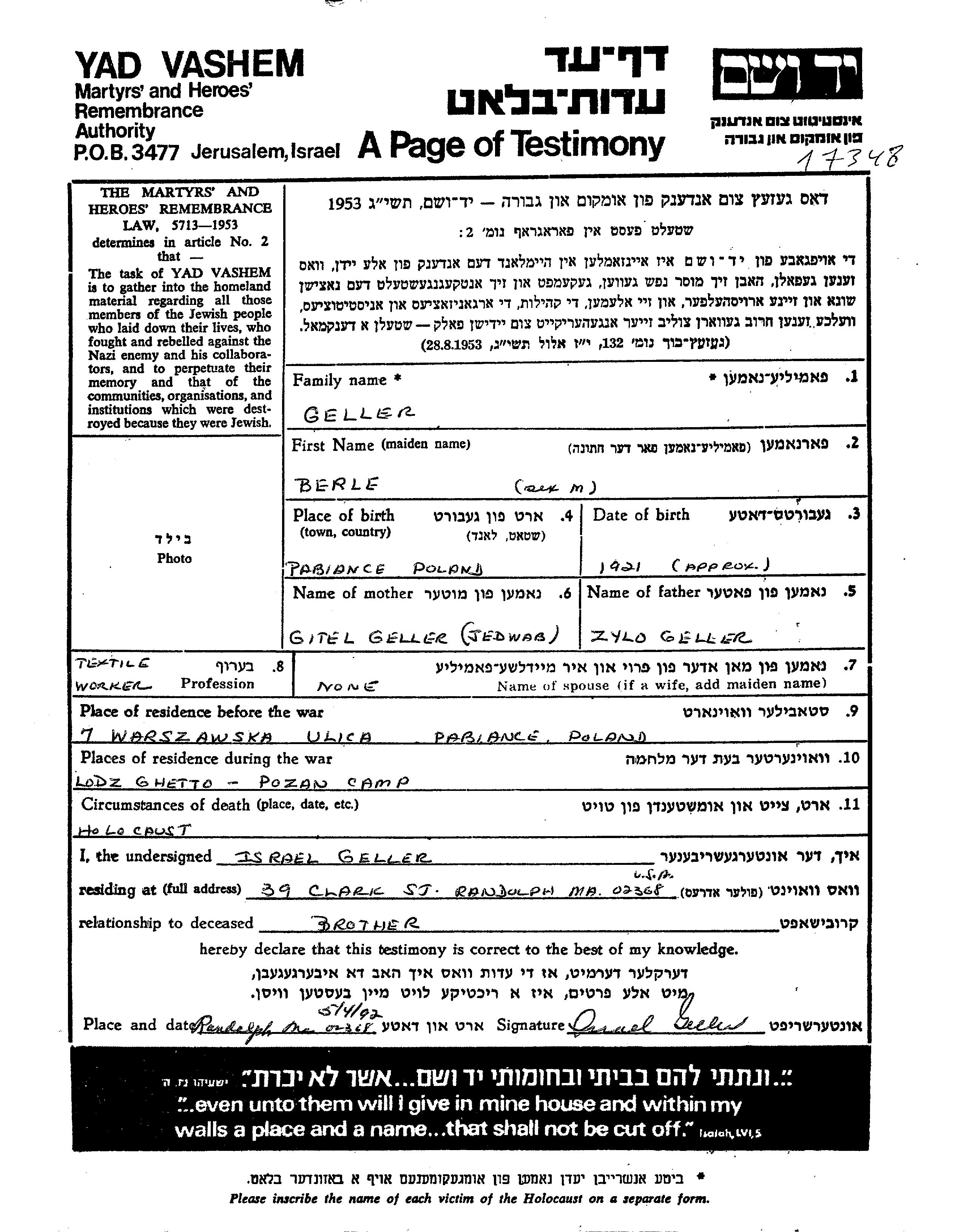 Берле Геллер, место рождения: Пабьянице, Польша. Отец: Зило, mать:Гитель, девичья фамилия Едваб. Рабочий / рабочая. Холост / не замужем. Место жительства до войны: Пабьянице, Польша. Место во время войны: Лодзь, Польша.