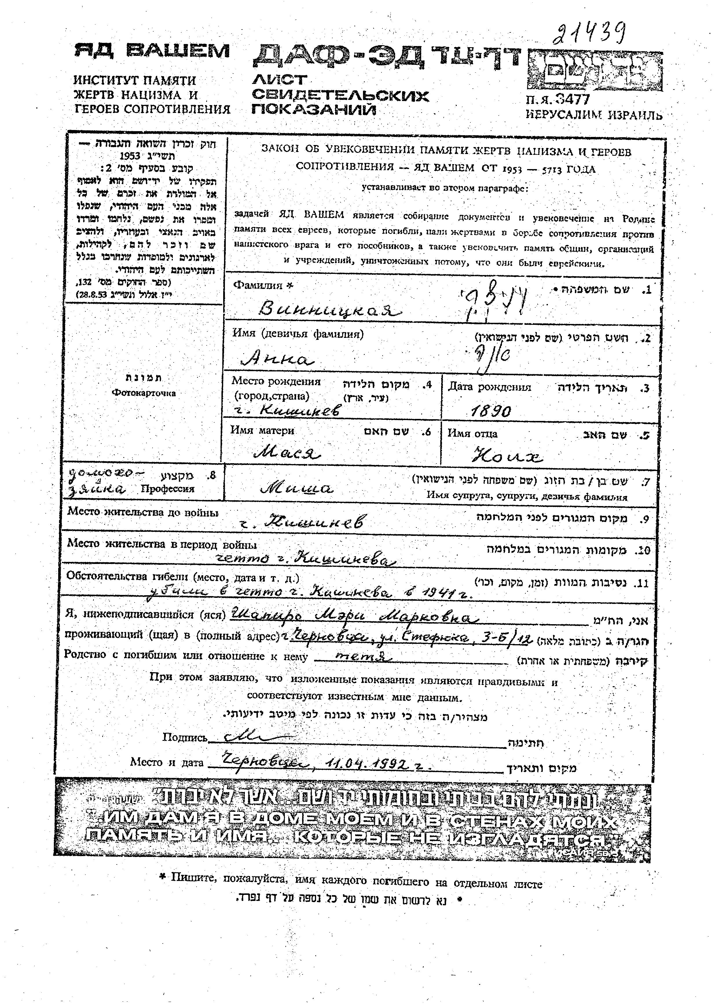 Виницкий Ана 1890 Кишинёв, Румыния Лист свидетельских показаний