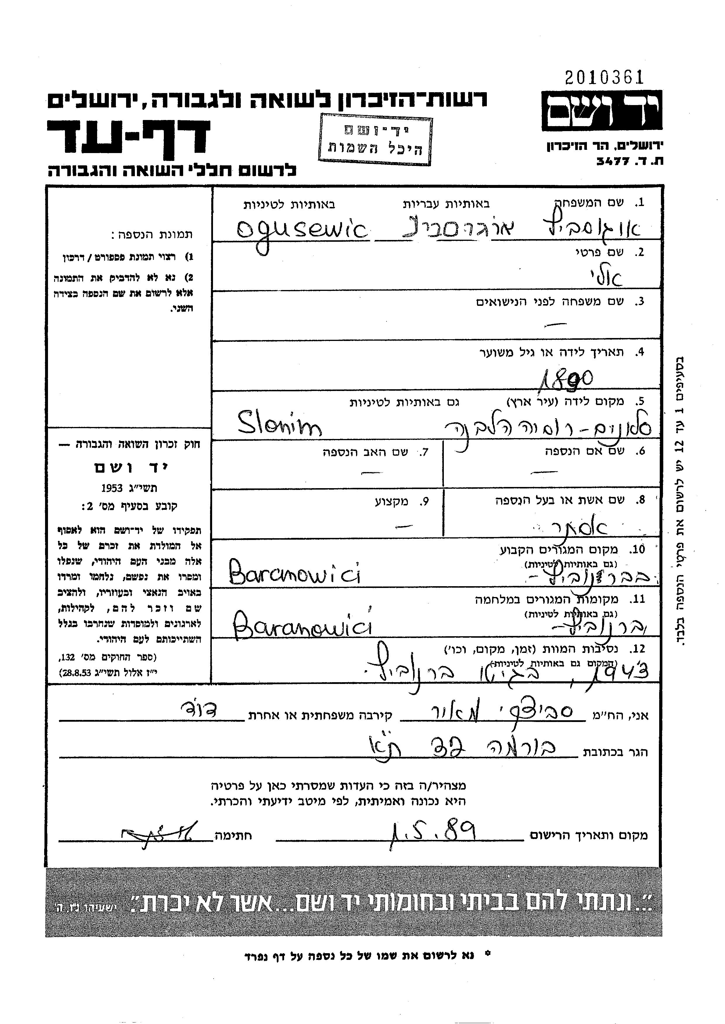 Огусевич Эли 1890 Барановичи, Польша Лист свидетельских показаний