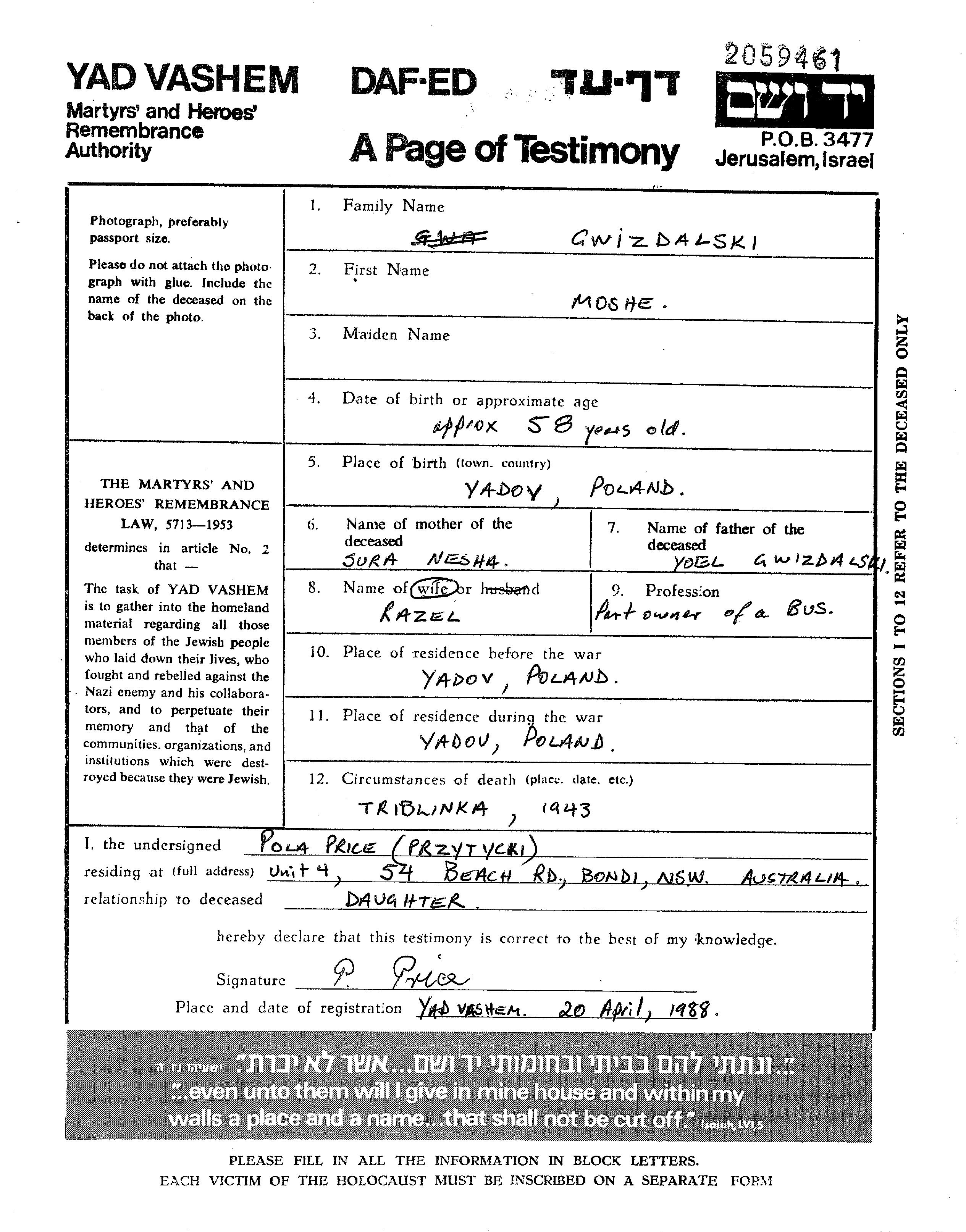 Моше Гвиздальски, место рождения: Ядув, Польша. Отец: Йоэль, mать:Сура Неша. Шофер. Женат / замужем. Место жительства до войны: Ядув, Польша. Место во время войны: Ядув, Польша.