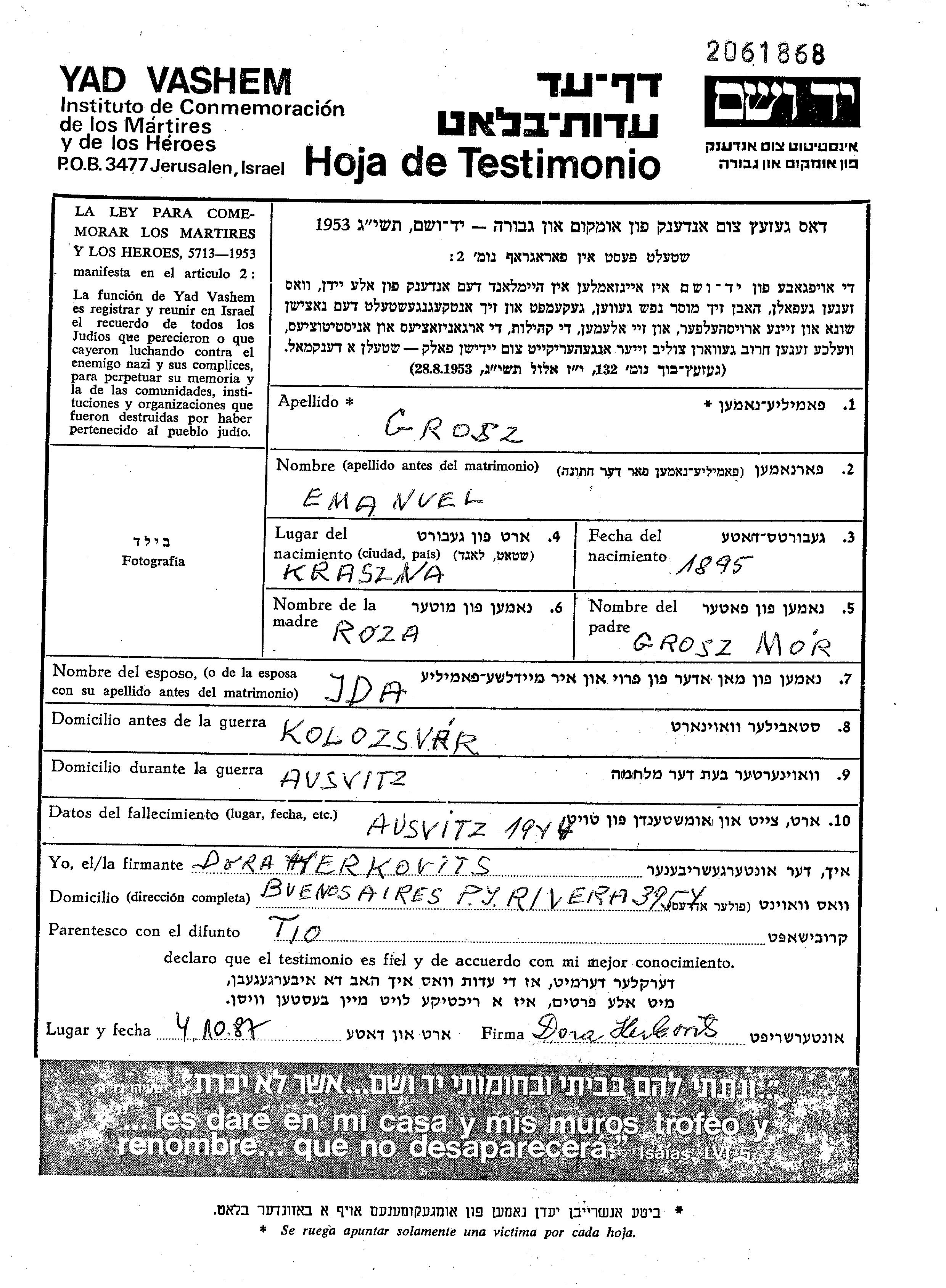 Эмануэль Грос, место рождения: Красна, Румыния. Отец: Мор, mать:Роза. Женат / замужем. Место жительства до войны: Коложвар, Румыния.