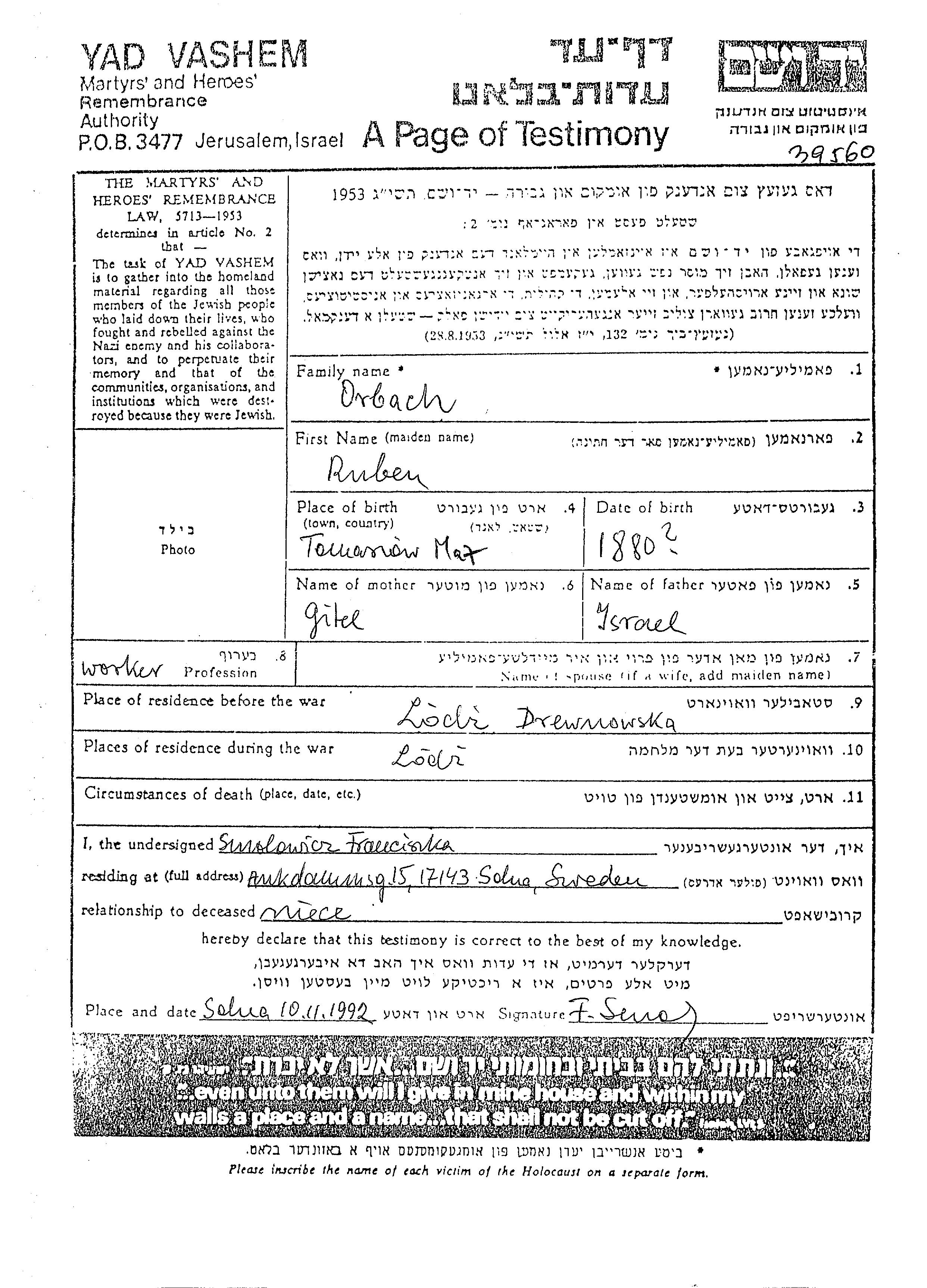 Реувен Орбах, место рождения: Томашув-Мазовецки, Польша. Отец: Исраэль, mать:Гитель. Место жительства до войны: Лодзь, Польша. Место во время войны: Лодзь, Польша.