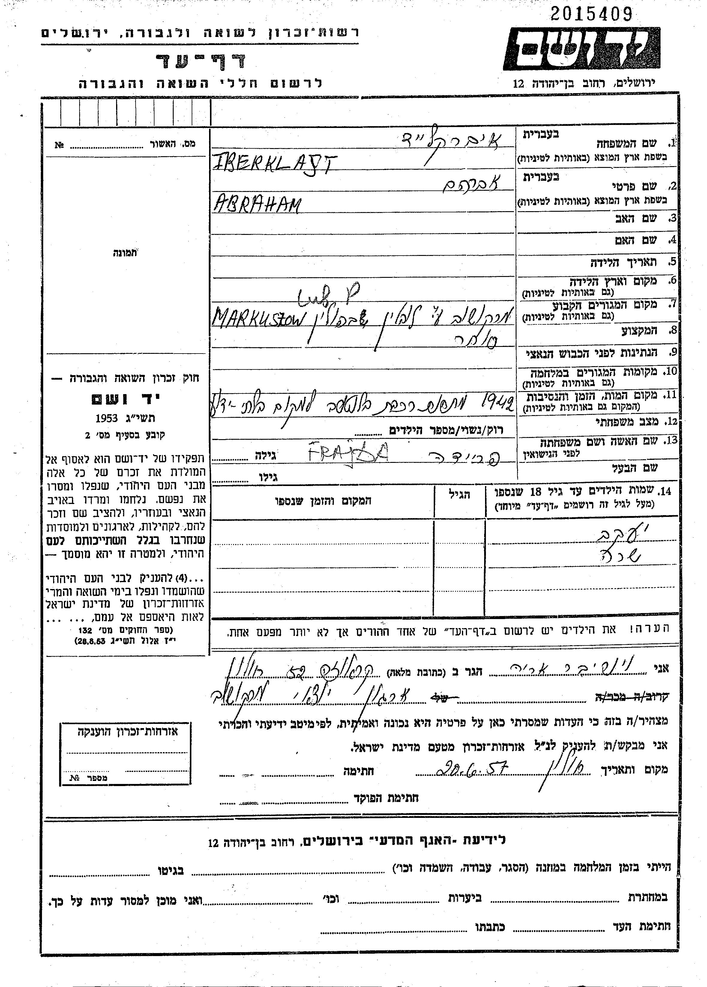 Абраам Иберклайт Иберклейд. Торговец / торговка. Женат / замужем. Место жительства до войны: Маркушув, Польша.