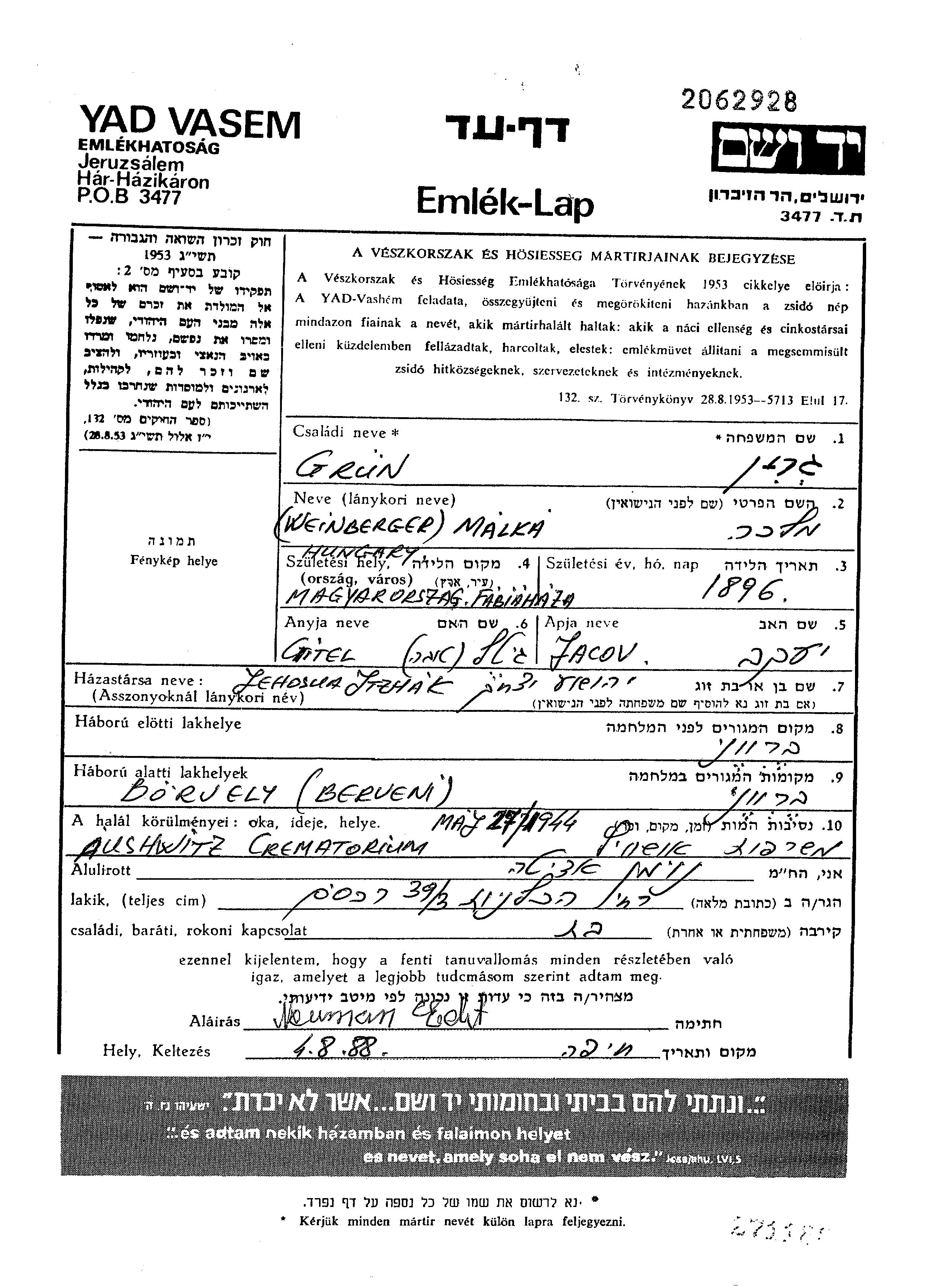 Малка Грюн, девичья фамилия Вейнбергер, место рождения: Фабианхаза, Венгрия. Отец: Яков, mать:Това Гитель. Женат / замужем. Место жительства до войны: Борвей, Румыния. Место во время войны: Борвей, Румыния.