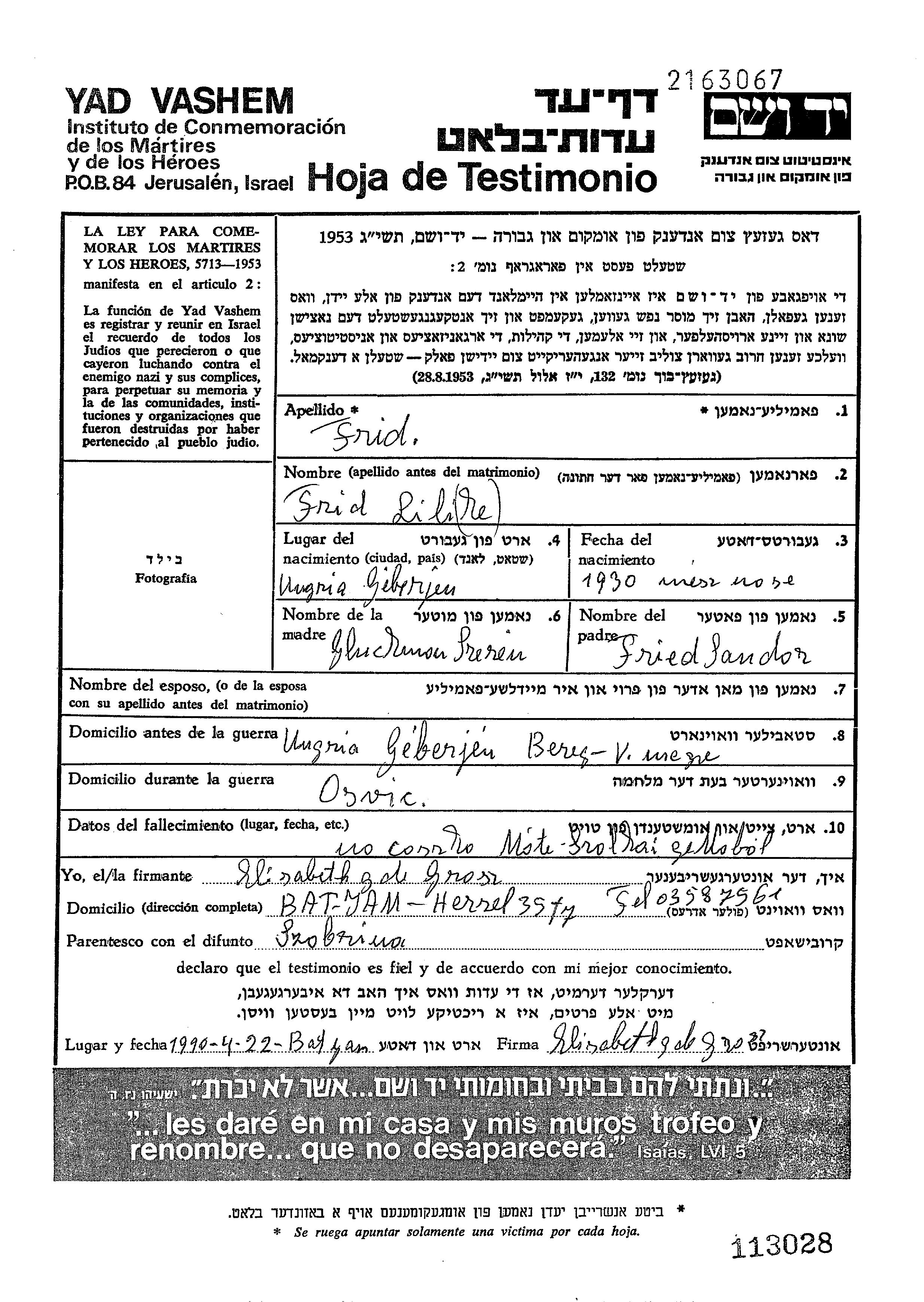 Лили Фрид, место рождения: Геберьен, Венгрия. Отец: Сандор, mать:Серен, девичья фамилия Глукман. Ребенок. Место жительства до войны: Геберьен, Венгрия. Место во время войны: Матесалька, Венгрия.