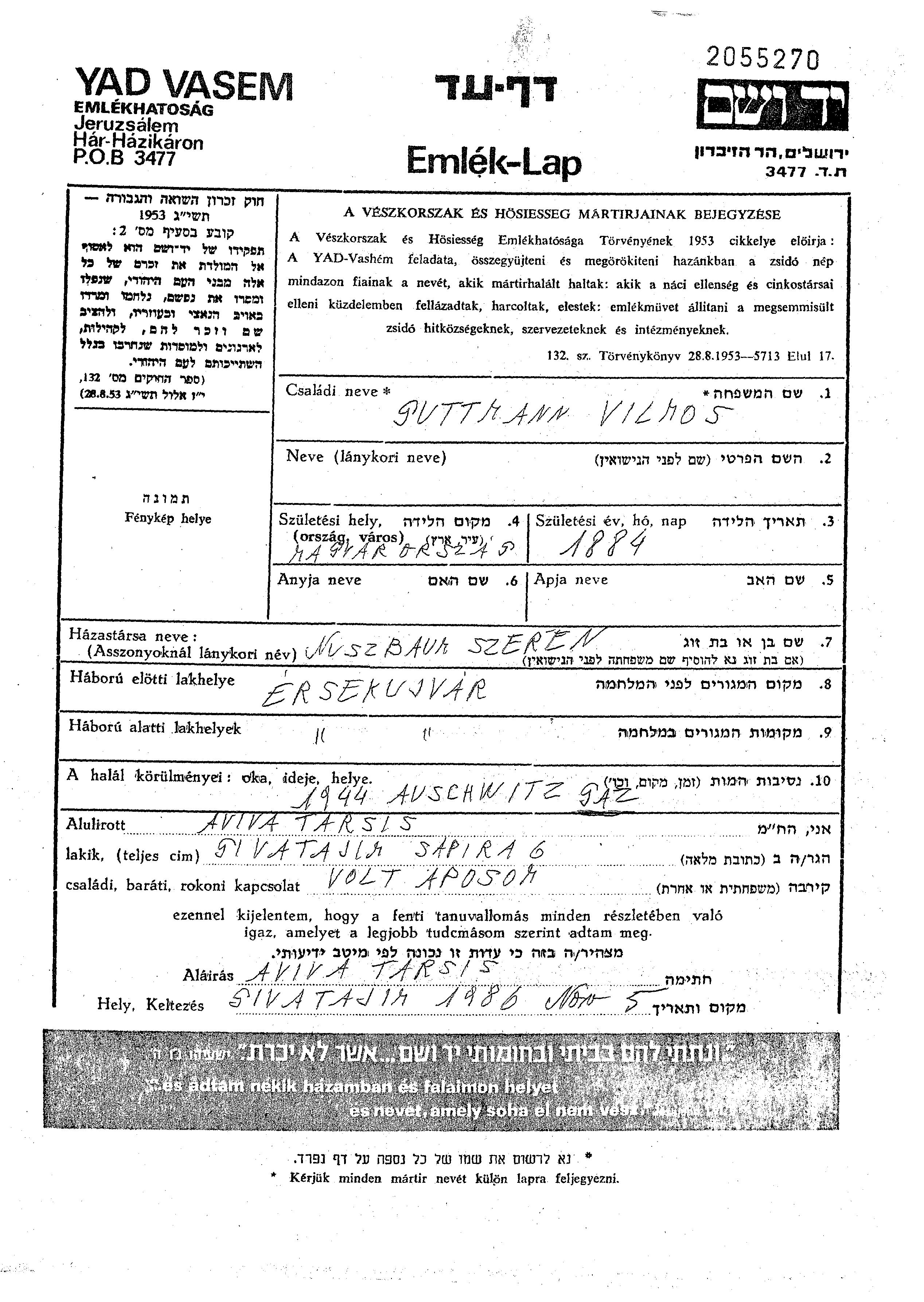 Вильмош Гуттманн, место рождения: Венгрия. Женат / замужем. Место жительства до войны: Эршикюйвар, Чехословакия. Место во время войны: Эршикюйвар, Чехословакия.