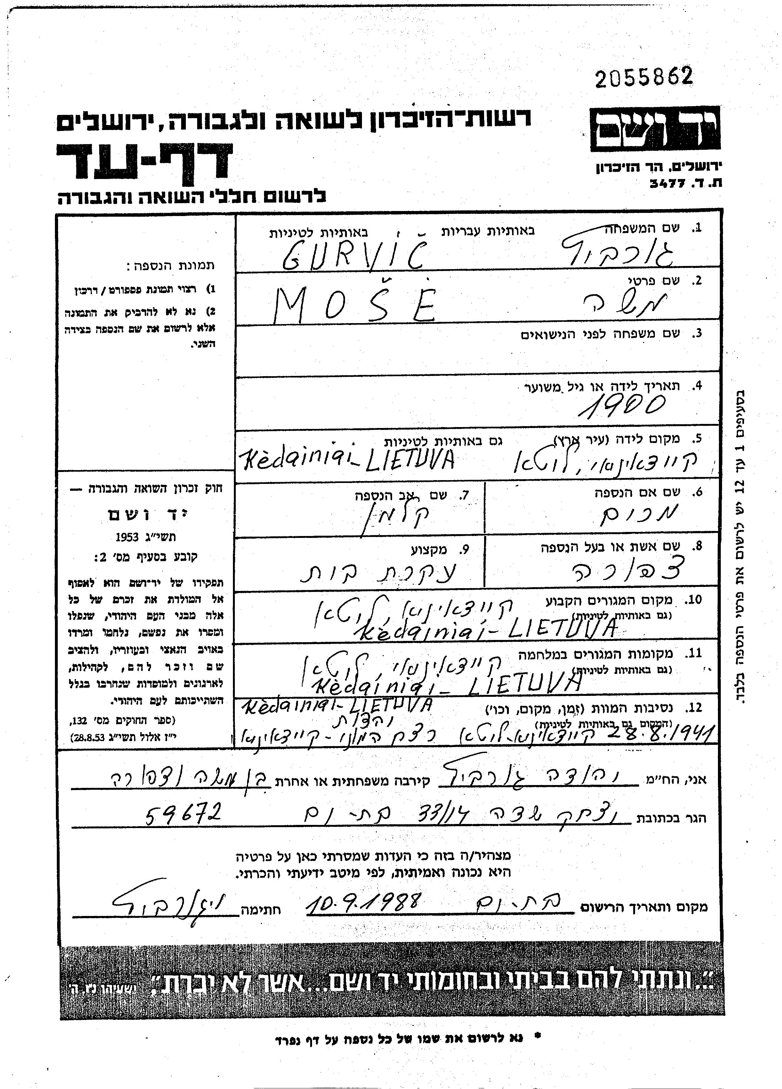 Моше Гурвиц, место рождения: Кейданяй, Литва. Отец: Кальман, mать:Мирьям. Земледелец / земледелица. Женат / замужем. Место жительства до войны: Кейданяй, Литва. Место во время войны: Кейданяй, Литва.