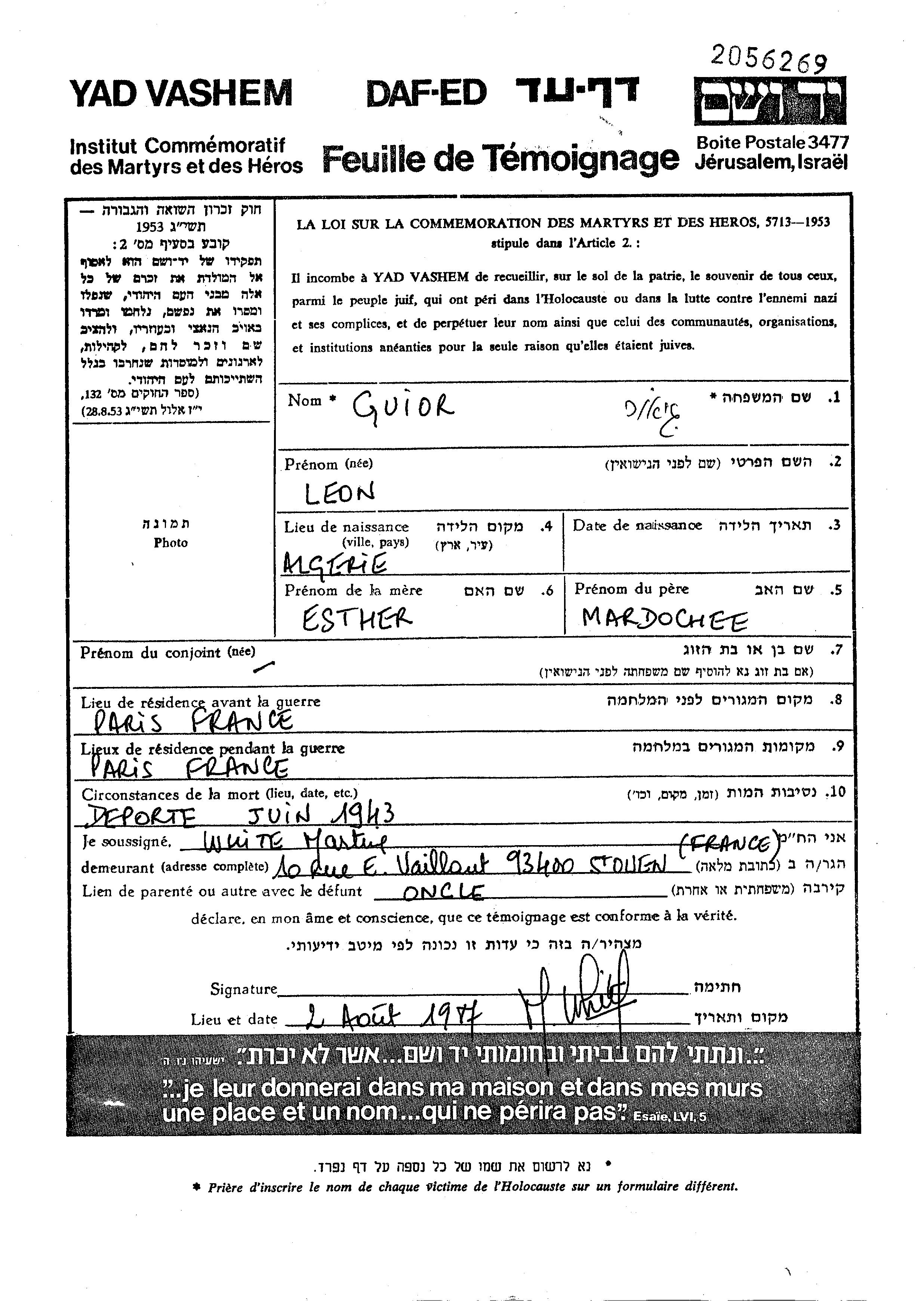 Леон Гиор, место рождения: Алжир. Отец: Мардоше, mать:Эстер, девичья фамилия Хериф. Место жительства до войны: Париж, Франция. Место во время войны: Париж, Франция.