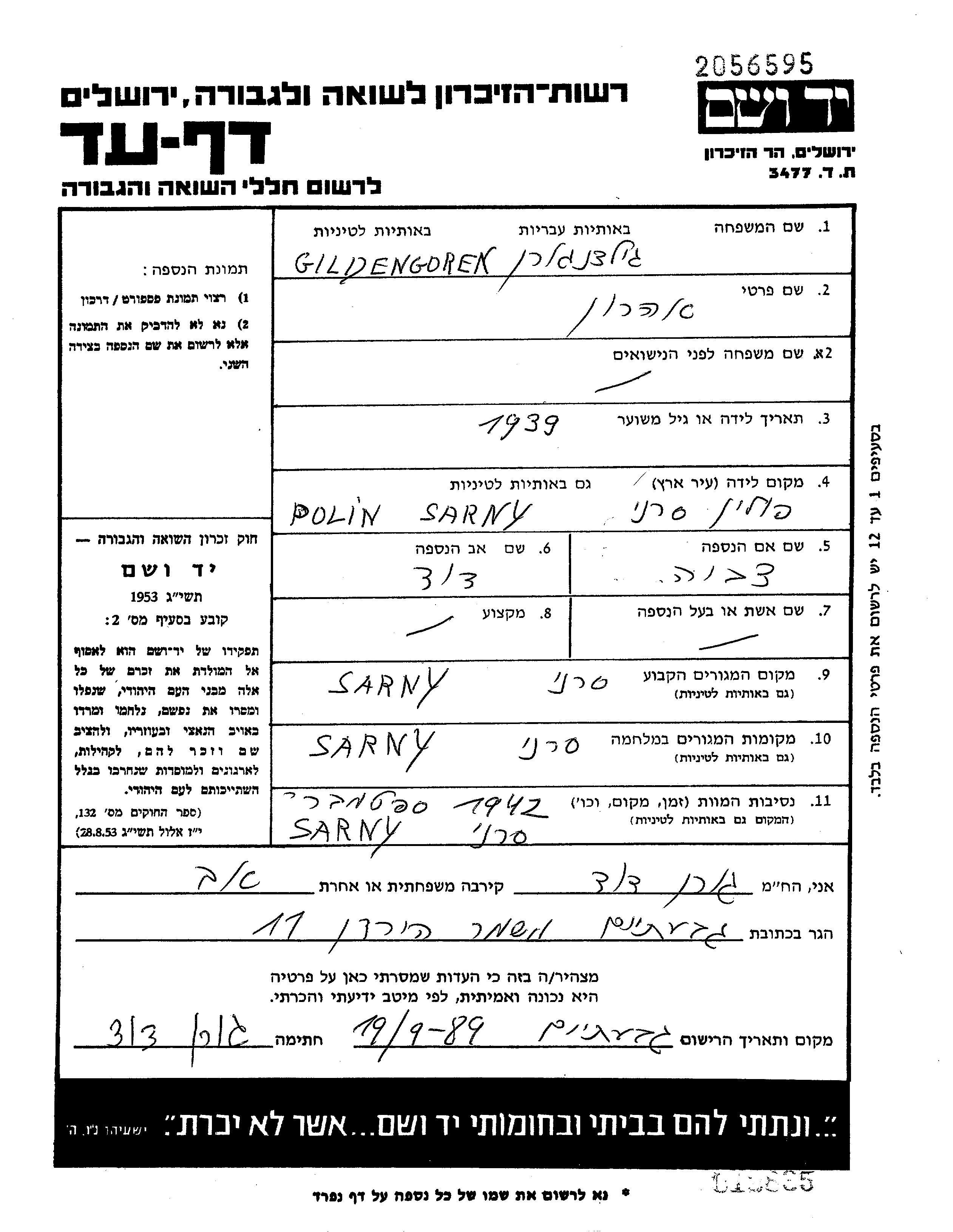 Гильденгорен Арон 1939 Сарны, Польша Лист свидетельских показаний