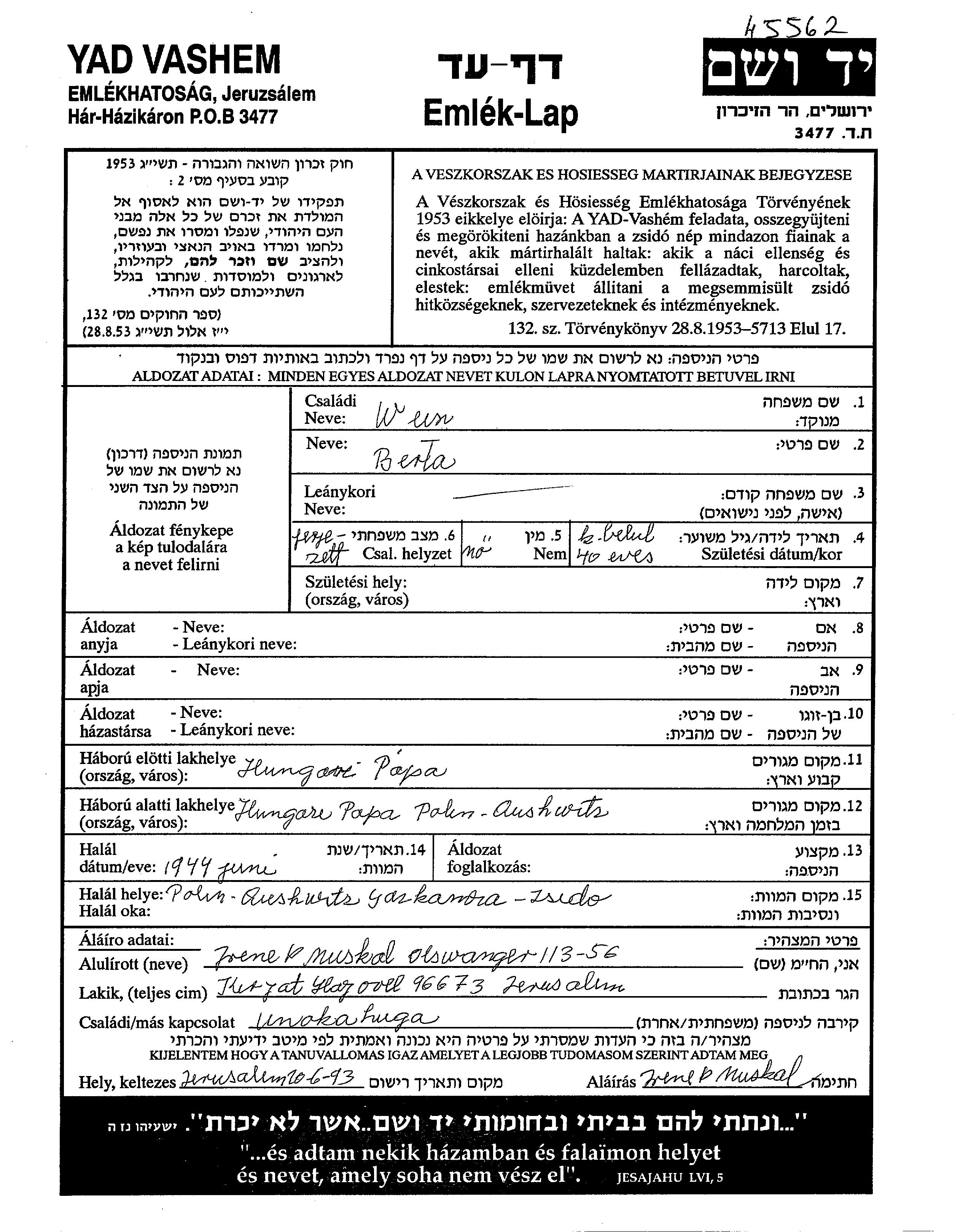 Берта Вейс. Место жительства до войны: Папа, Венгрия. Место во время войны: Папа, Венгрия.