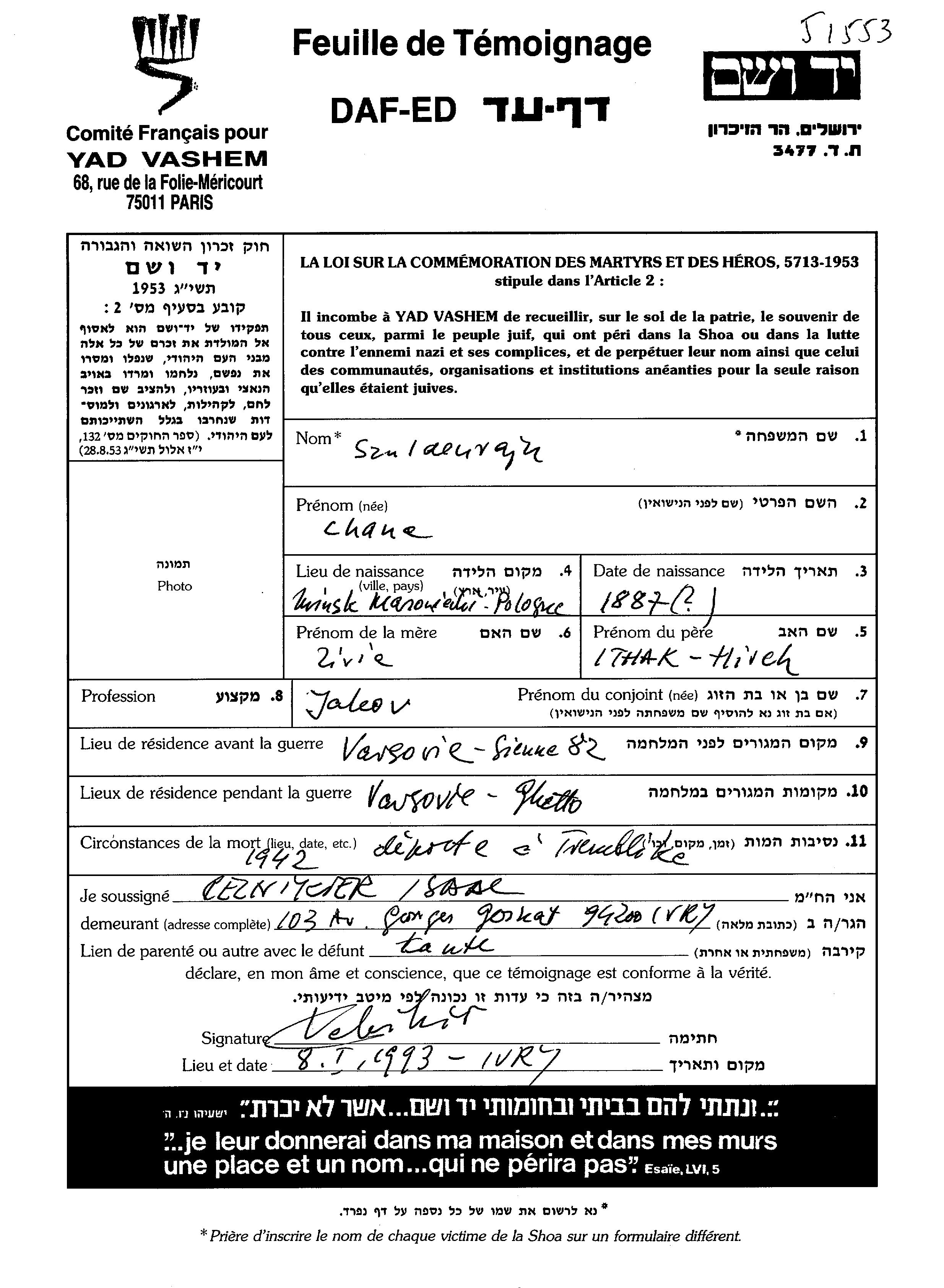 Хана Шульденрайн, место рождения: Миньск-Мазовецки, Польша. Отец: Ицхак Хирш, mать:Зивия Цивья. Женат / замужем. Место жительства до войны: Варшава, Польша. Место во время войны: Варшава, Польша.