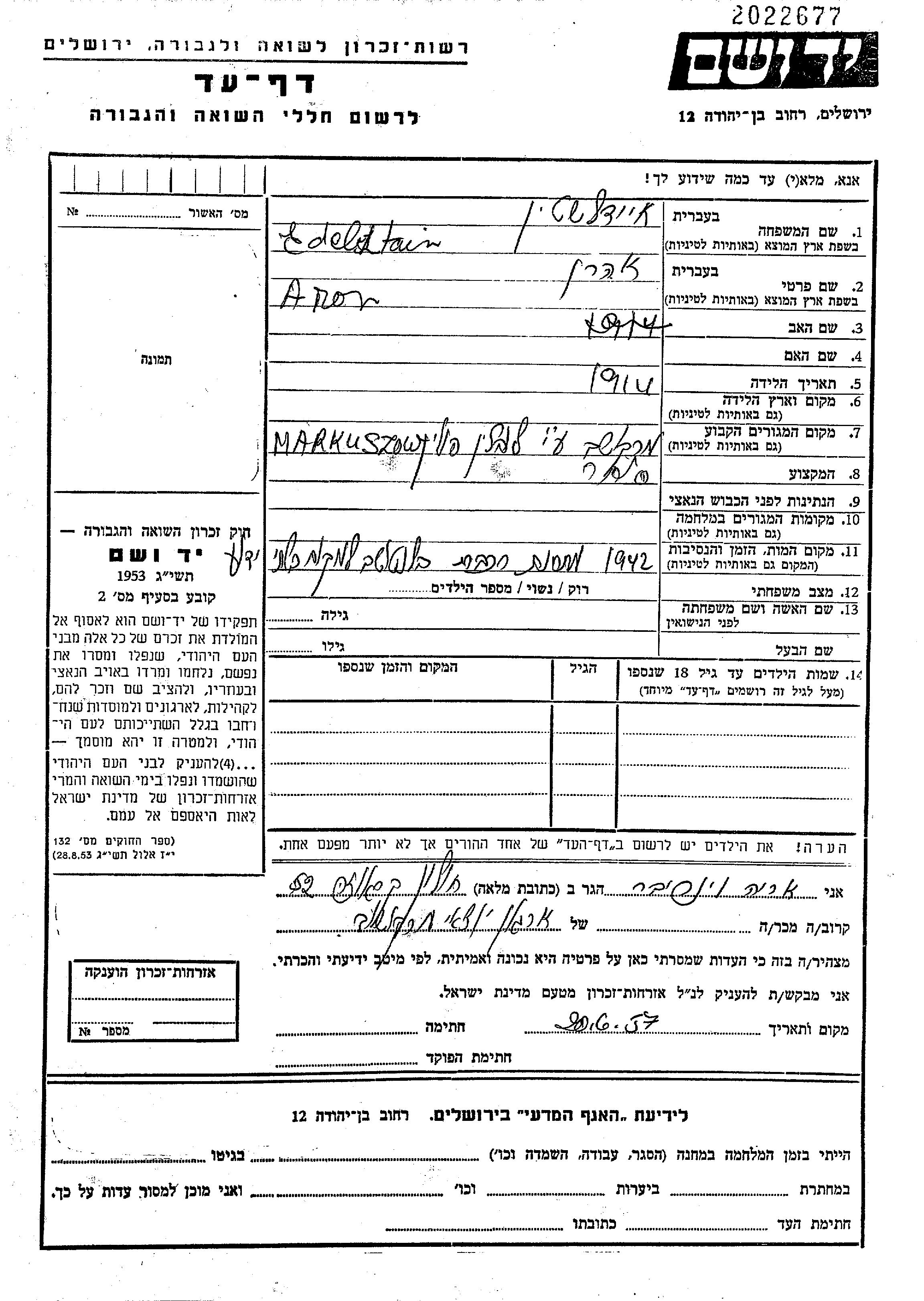 Эдельштайн Арон 1914 Маркушув, Польша Лист свидетельских показаний